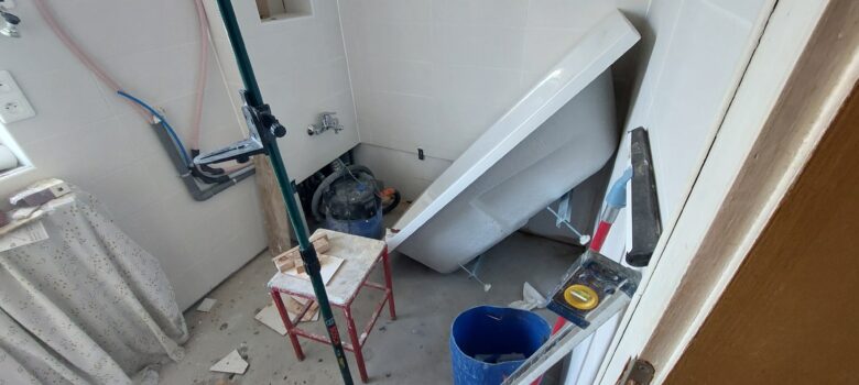 Installation d’une place de placo pour support de carrelage dans la niche de la salle de bain, finalisation du carrelage au mur. Installation du robinet de la baignoire et des attaches de baignoire. Vernissage de la poutre installée dans la chambre nord-est. Mise en place d’une seconde couche de résine…