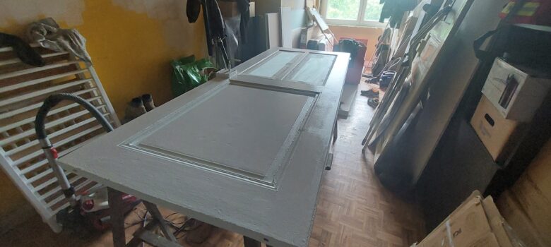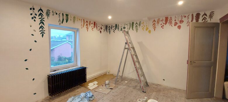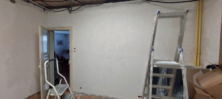 Quelques retouches dans la chambre Ouest et mise en peinture des tuyaux de radiateur Mise en place des tablettes de fenêtre de la chambre Est. Restera quelques finitions et, dans la chambre parentale, au niveau de la cloison de douche Descente de la porte du bureau et installation des vitres…
