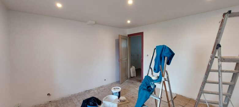 Petit coup de peinture sur le tour du tuyau de poêle dans le salon