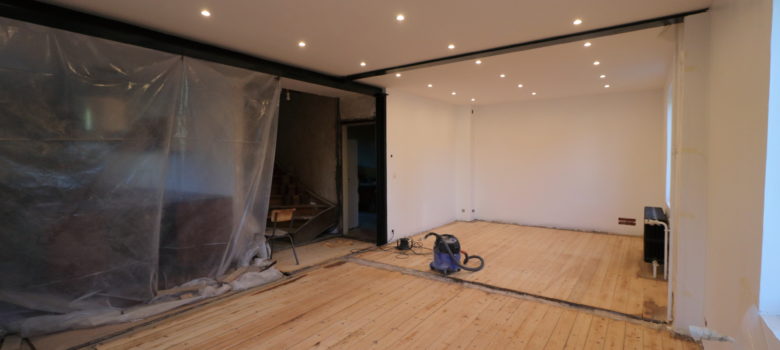 Ponçage des parquets du salon, suite Joint silicone dans la chambre, partie salle de bain