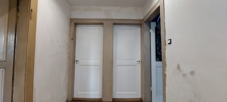 Mise en peinture des huisseries du bureau Peinture de la porte, côté bureau Remise en place de la tablette de fenêtre dans la chambre Est Installation d’une boîte électrique pour mettre un commande afin de piloter la VMC depuis la salle de bain. Casse du mur pour mettre en place…