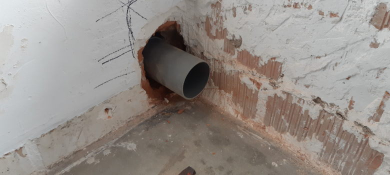 La journée d’hier n’a pas suffit à tout finir. On continue aujourd’hui l’évacuation. On continue avec la préparation du sous-sol pour passer les tubes PER du réseau d’eau froide. On prépare le passage de tube dans la base de la cheminée (partie plaine) Petite surprise sur le perçage entre l’atelier…