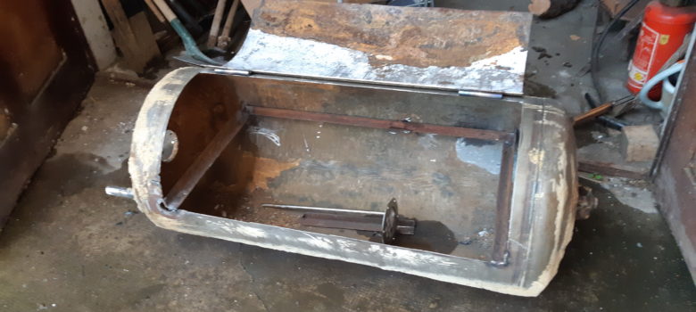 Poursuite du barbecue dans le vieux chauffe-eau. C’est le grand jour, on sort tous les outils, grosse meuleuse, petite meuleuse, poste à souder et scie sabre. Mise en place des charnières maintenue avec une chaine et ressort trouvé dans le garages, le temps de la soudure. La réalisation des soudures…