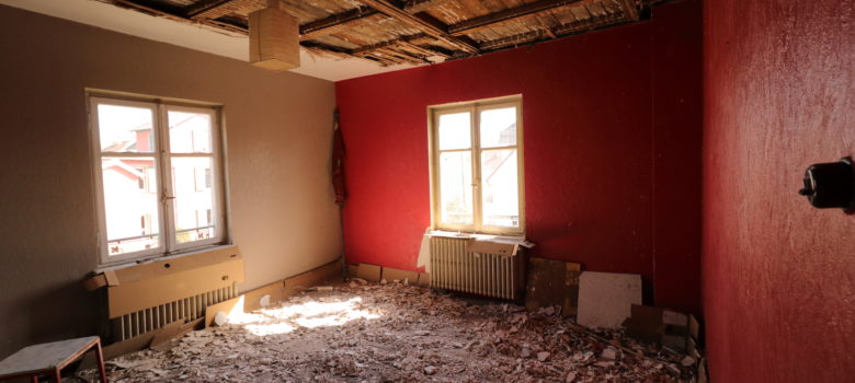 Une cuisine à l’étage c’est une bonne idée pour une maison bi-famille. Ca ne convient pas réellement à ce que l’on souhaite vu que cette pièce est censé être transformée en bureau du fait qu’elle est exposée au sud et à l’est. Boom un coup de masse dans l’évier et…