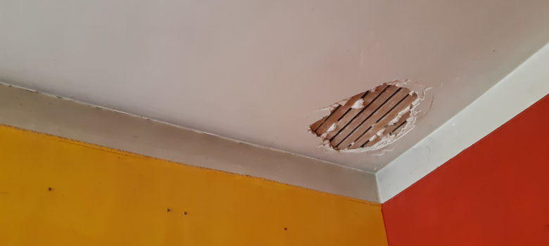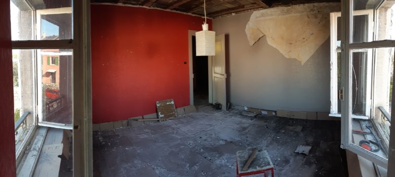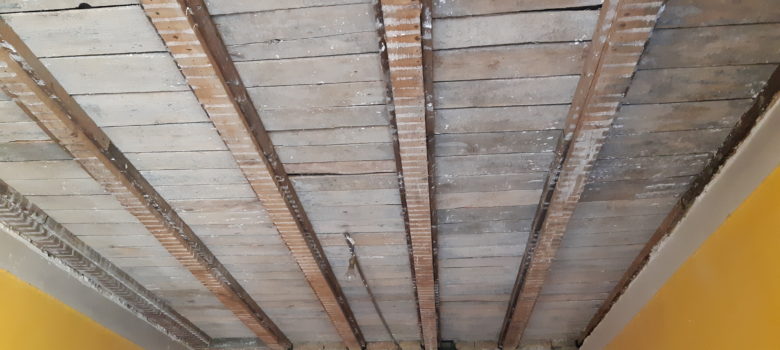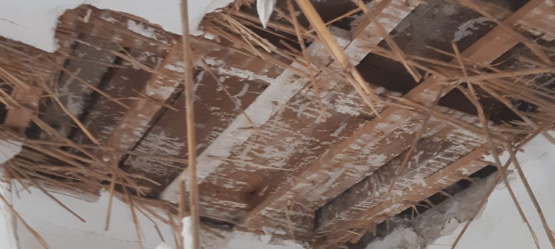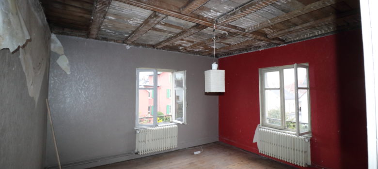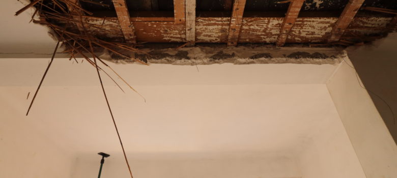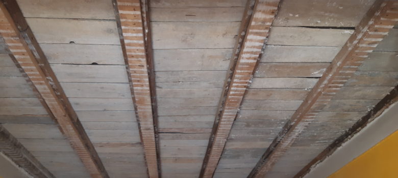 Plafond démonté et partiellement évacué. Découverte de scories entre le plafond et le plancher du grenier. Etant donné l’apparence, il pourrait s’agir de scories volcaniques à cause de ce côté très léger et poreux. D’un autre côté, dans une région minière, des scories issues de la métallurgie ne seraient pas…