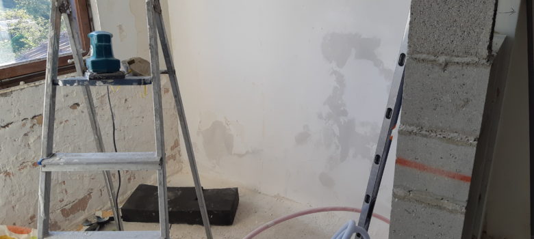 Ponçage du mur de la chambre, côté salle de bain pour obtenir une surface la plus plane possible Découpage du bois restant et stockage