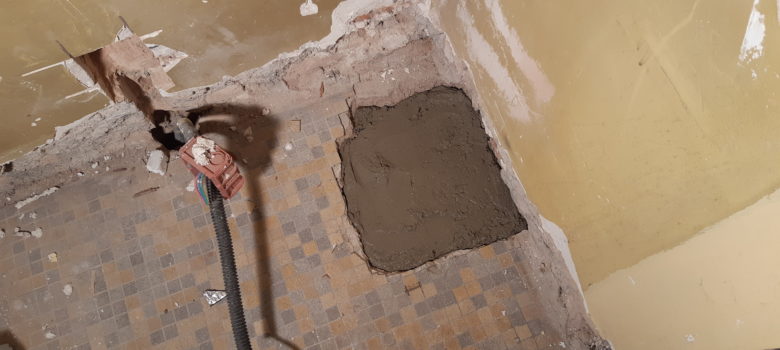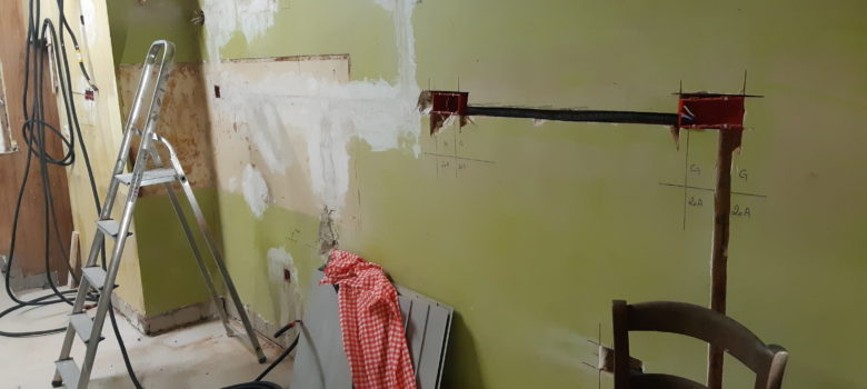 En arrivant, retrait des étais qui tenait les bétons de l’ancienne colonne d’évacuation. Le béton est bien dur mais surement pas encore sec en profondeur. Assez pour retirer les consolidation dans tous les cas. Suite d’hier avec le perçage des trous pour l’électricité de la cuisine, ce sont maintenant les…