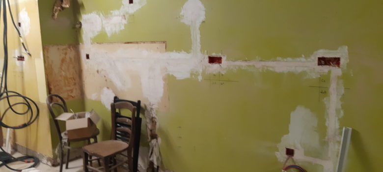 Ouverture des prises électrique du salon Bouchage de trous dans la cuisine Préparation de briques pour reboucher la cheminée