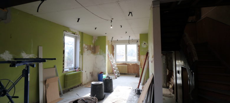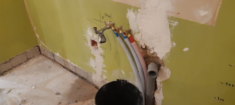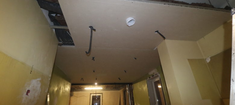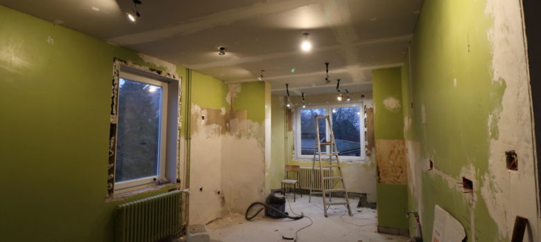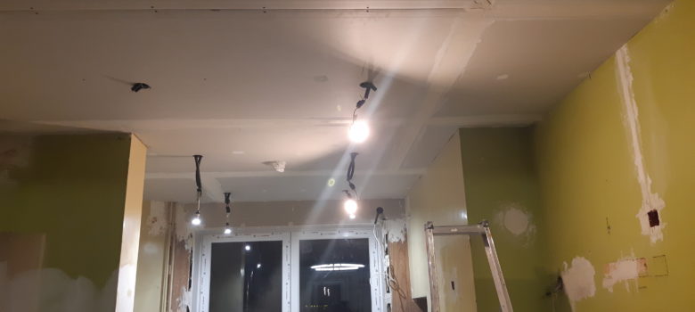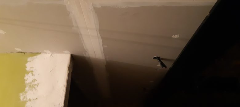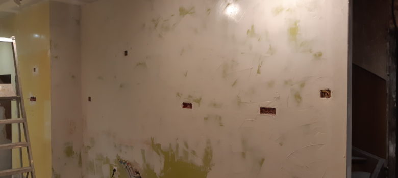 Blocage des gaines de ventilation et électrique qui passent dans la cheminée avec de la mousse expansive. Une fois les trous fermés, on commencer la finition des plaques avec des découpes complexes et remplissage avec du plâtre du poteau entre la cuisine et l’escalier. et pour finir quelques joints acryliques…