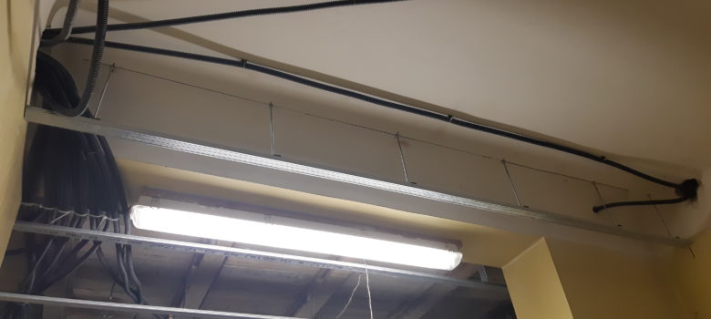 Divers préparatifs avant d’engager la première plaque de plafond. Installation d’une plaque pour entour le poteau en bois entre l’escalier et la cuisine Raccordement électriques Mise en place du haut des entourages de fenêtre avec quelques ajustements sur-mesure. Un peu de plâtre pour boucher quelques prises à droite à gauche….