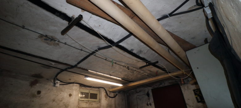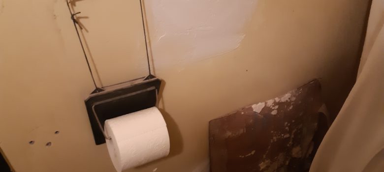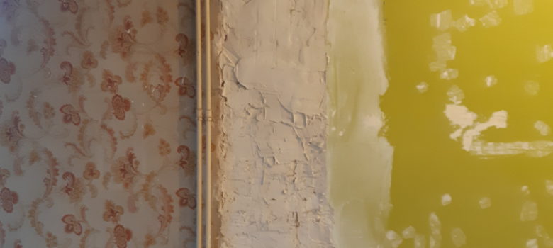 Ponçage du plafond Bouchage de quelques trous Installation dans l’escalier d’un échafaudage de fortune pour casser le plafond Ménage