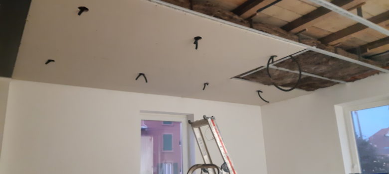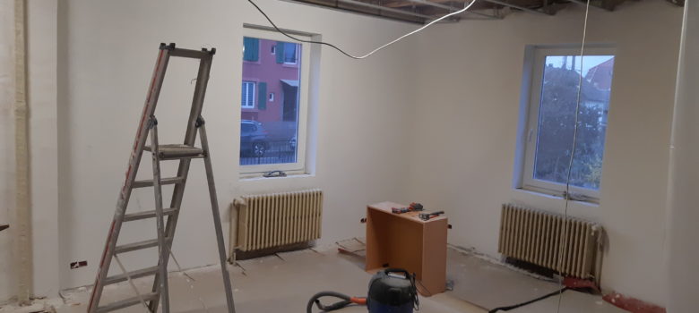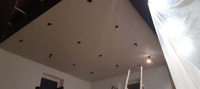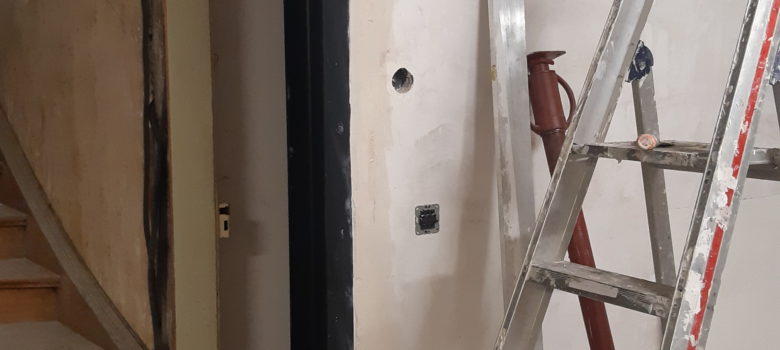 Enduit dans le salon Platre sur le mur de la douche dans la chambre Repérage de la frise de la partie salle de bain de la chambre Suite et fin du retrait de la souche du vieux mirabellier Ponçage Ménage