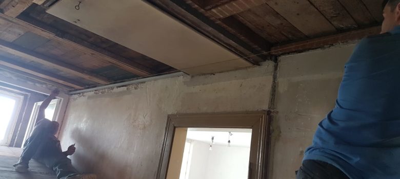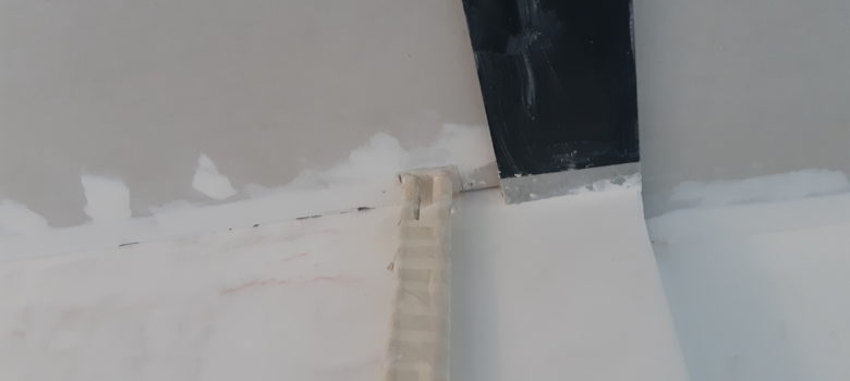Poursuite de l’installation du plafond de l’escalier Enduit dans la salon pour les bandes et les murs