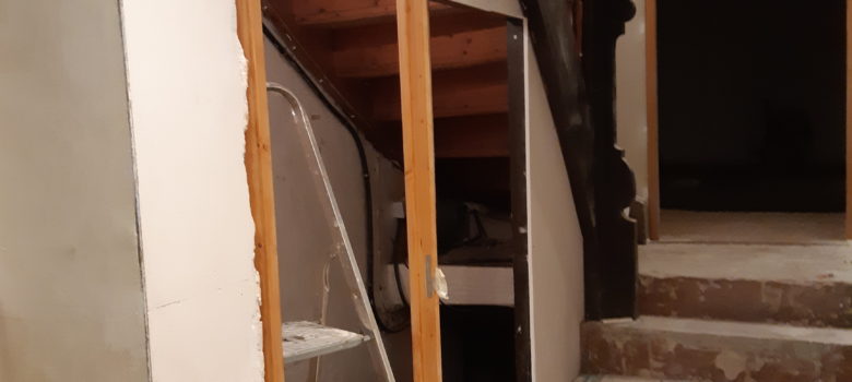 Avancée sur le carrelage. Arrivée au niveau de la porte de placard Ponçage de la cage d’escalier Bandes à placo sur les murs du couloir Enduit à bande
