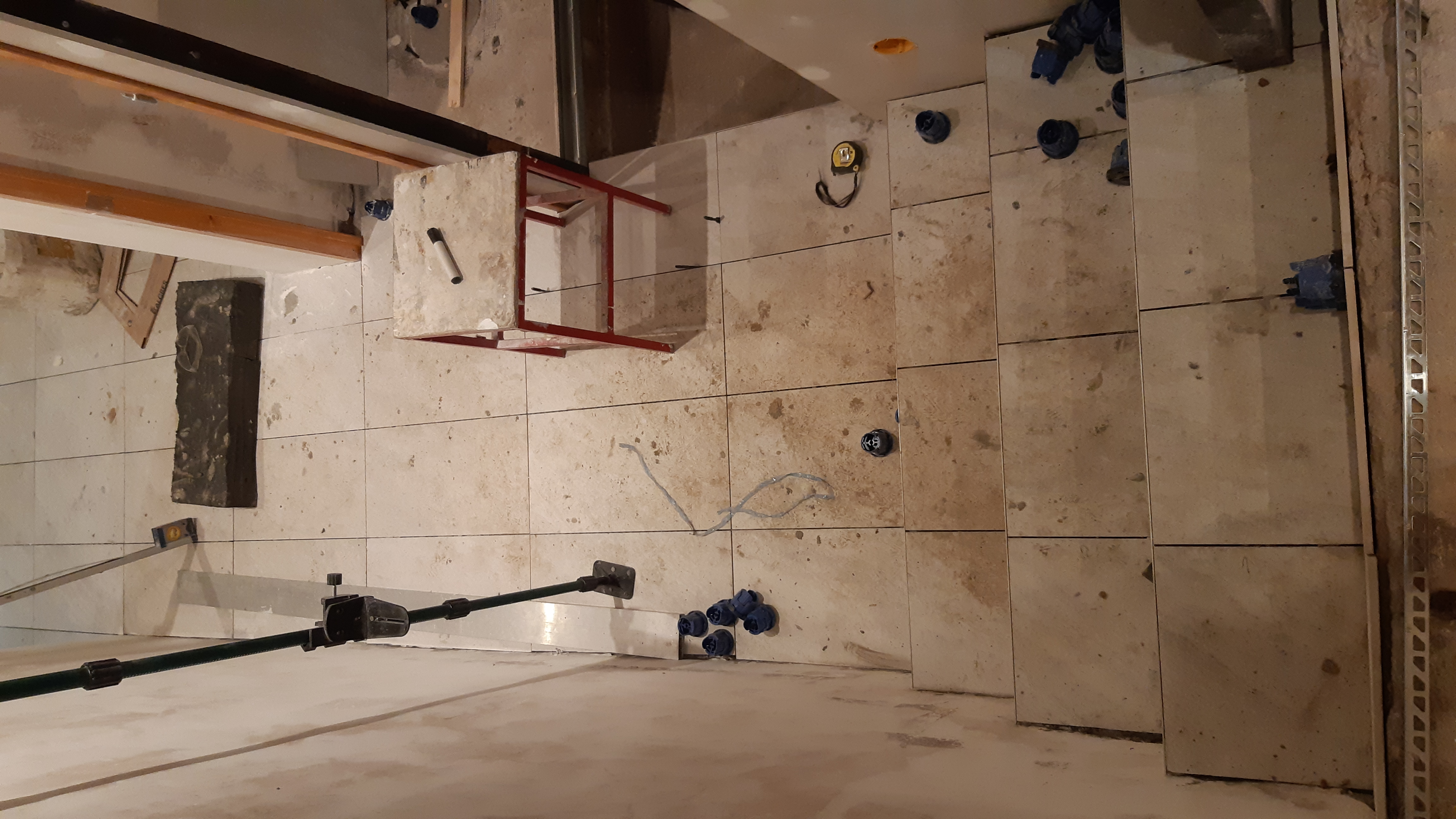 Réalisation des découpes de carrelage pour les coller plus tard Début de mise en place de la cloison du placard et de la cave Peinture de la porte coulissante relevé des prises prises interrupteurs électrique pour commander tout ce qu’il faut.