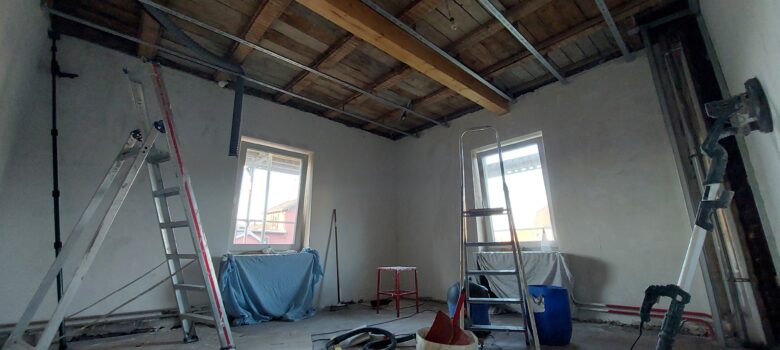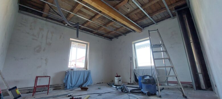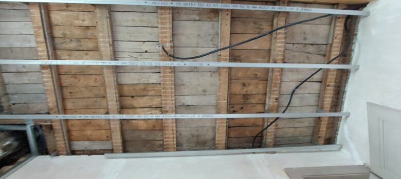 mise en place des derniers rails à placo du plafond et ponçage des murs dans la chambre à l’est. Mise en place d’une plaque de placo à côté du conduit de cheminée