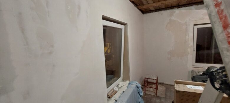 Enduit des murs de la chambre rouge et mise en place de 2 rails de faux plafond