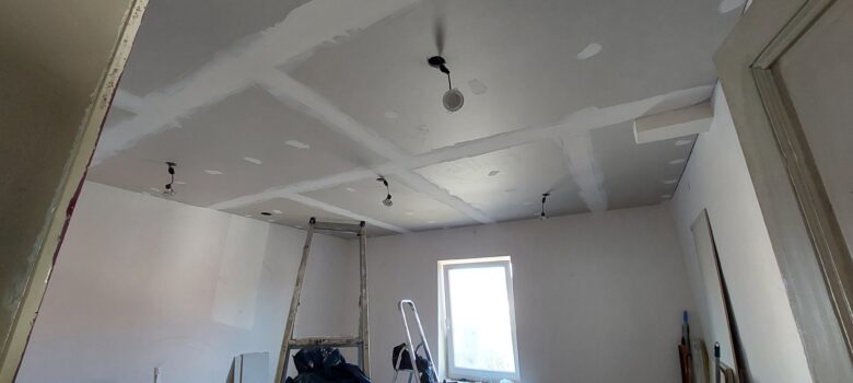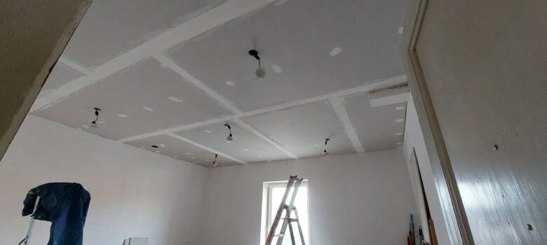 Première couche d’enduit sur les bandes du plafond.