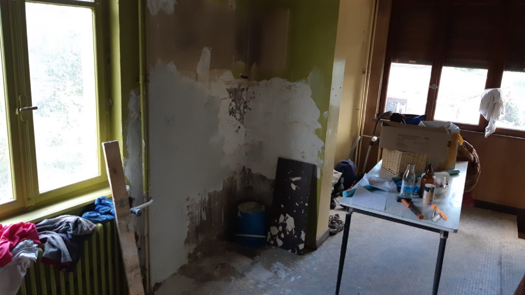 Poursuite du plâtre par JC dans la cuisine pour combler le gros trou de l’ancien évier