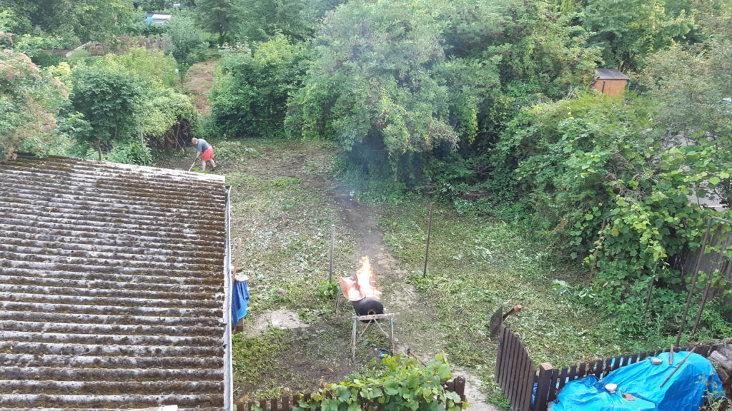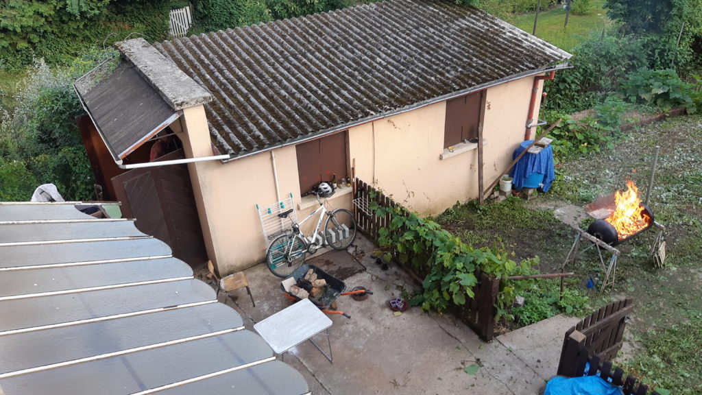 Lors de débarrassage des gravats de la cheminée, un voisin nous demande gentiment de tailler les sureaux qui dépassent du côté parking de l’immeuble voisin. JC se propose de le faire et ce sera donc au programme de vendredi. Fin de journée conviviale autour du barbecue peint au noir de ferronnerie et pleinement fonctionnel