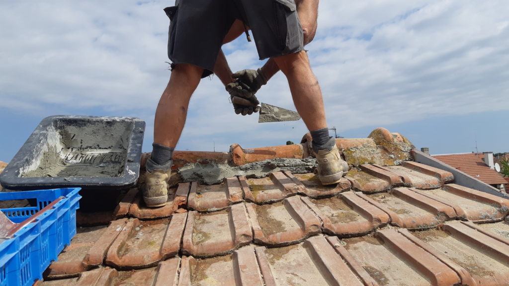 Après un passage à la déchèterie, on a un temps merveilleux ce matin et idéal pour s’attaquer à la dernière cheminée. Démontage complet de la dernière cheminée, celle côté Est.