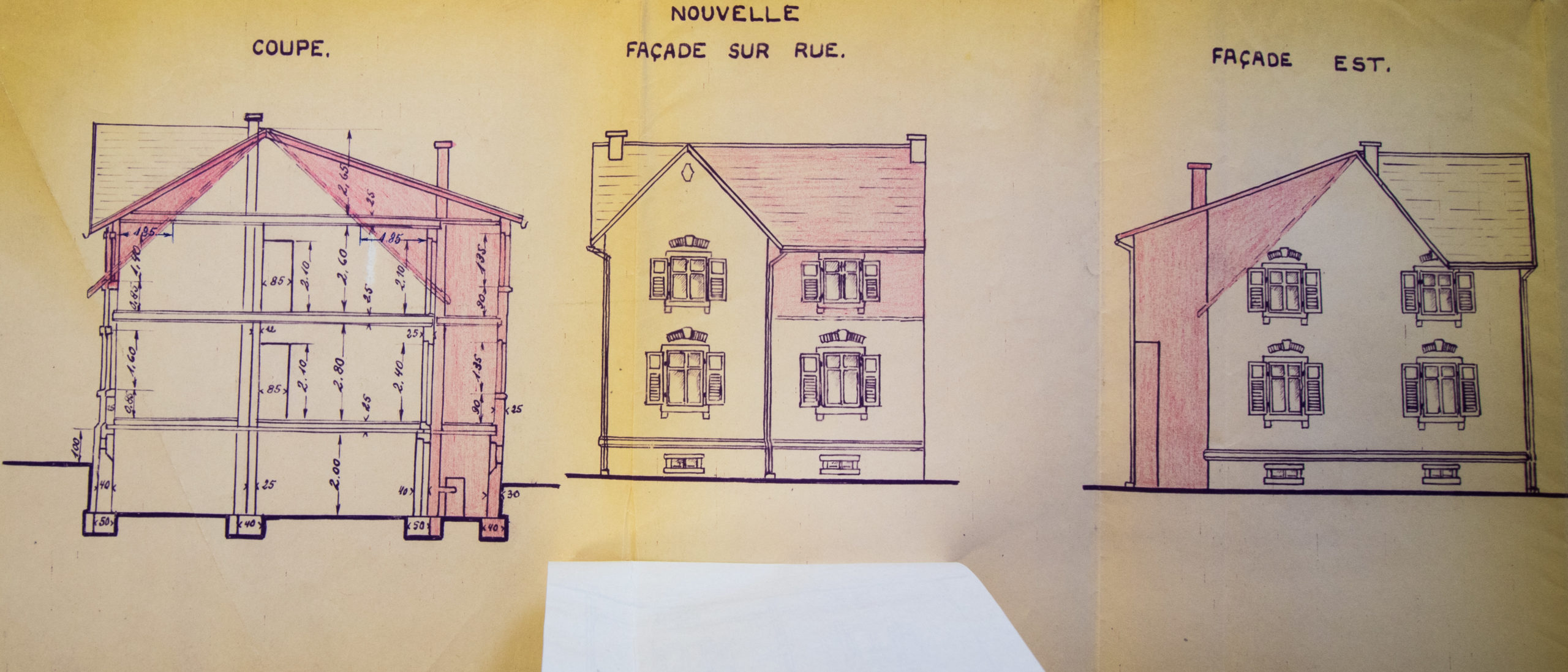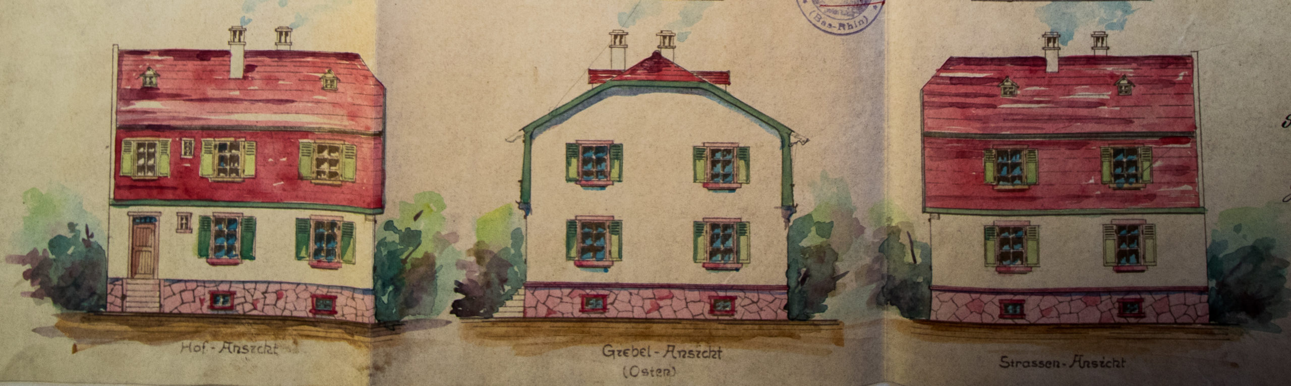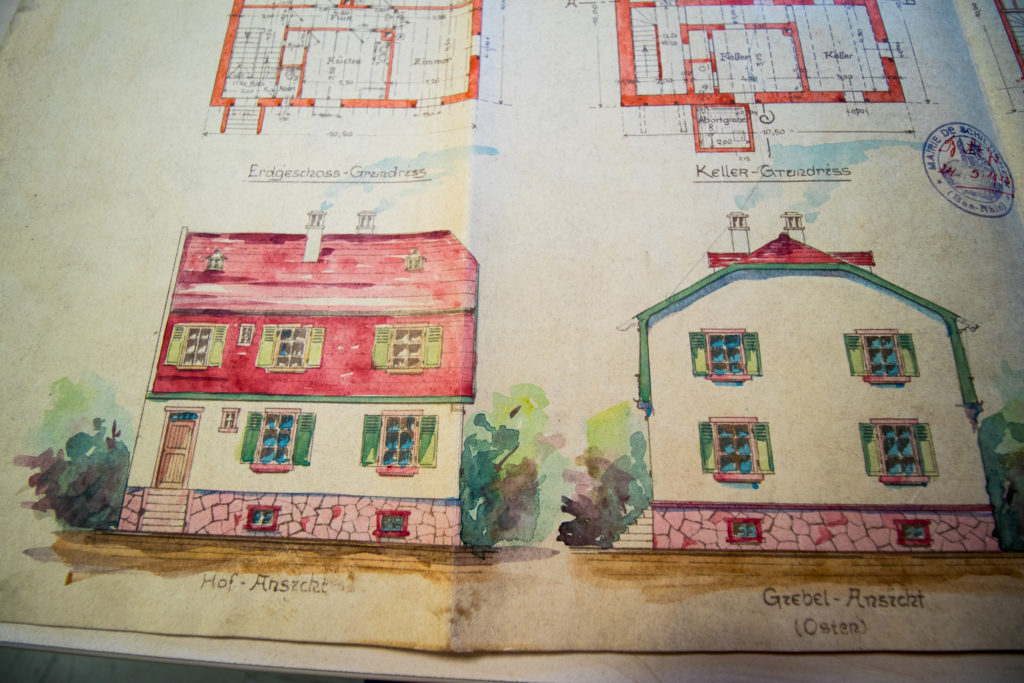Quoi de mieux que de prendre rendez-vous auprès de l’archiviste pour se rendre compte de l’historique d’une maison. Un dossier d’une quarantaine de pages tous traitant de la maison : projets, permis de construire, demande de travaux, autorisations et certificats… Une belle mine d’or d’information et… des plans dignes de tableaux en aquarelle ! Mais sur ce projet est inscrit « nicht aus gericht » n’a pas été réalisé. En effet, la maison en est tout autre mais on reconnait quand même quelques ressemblances, à commencer par la façade Est et Nord.