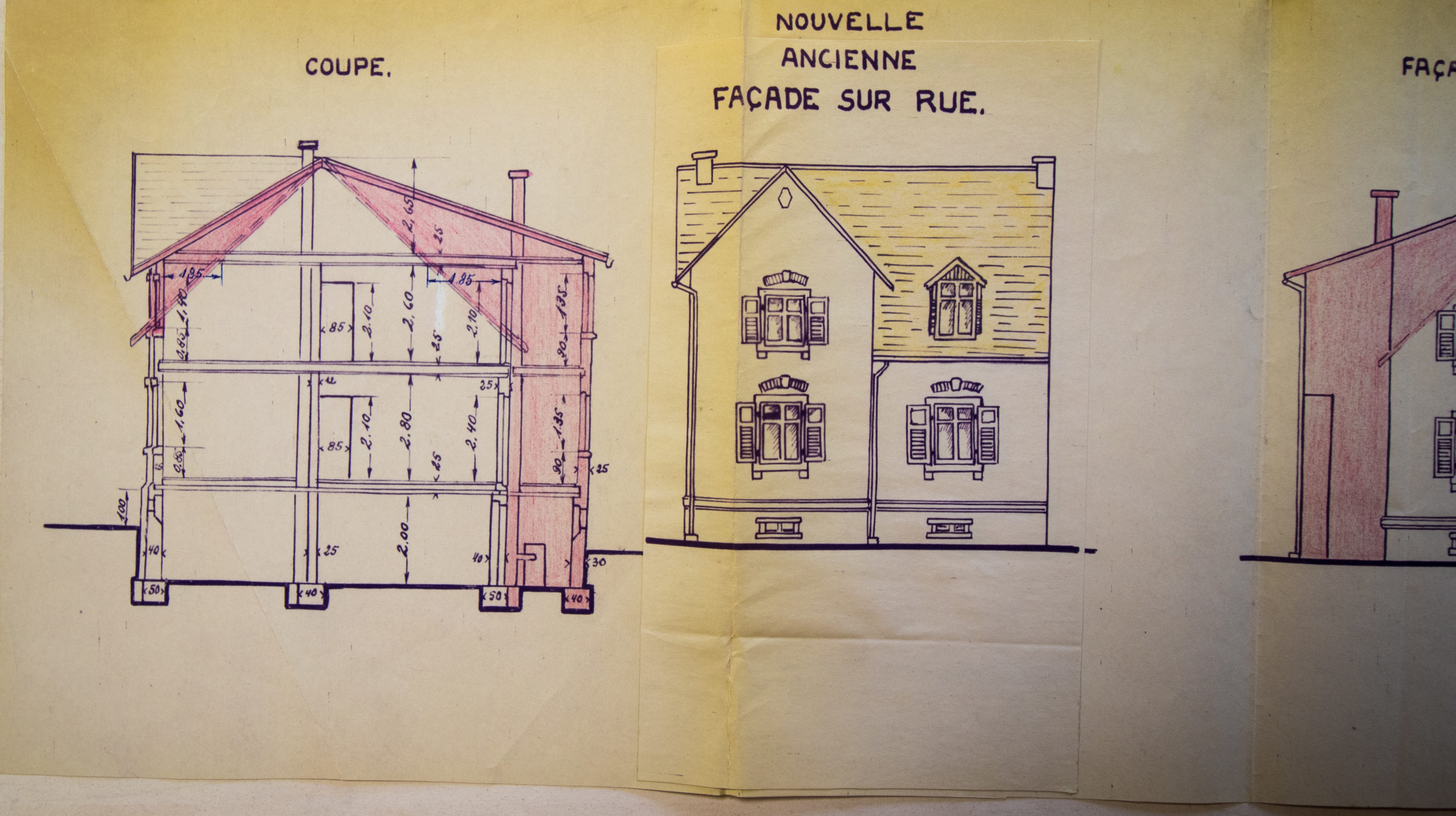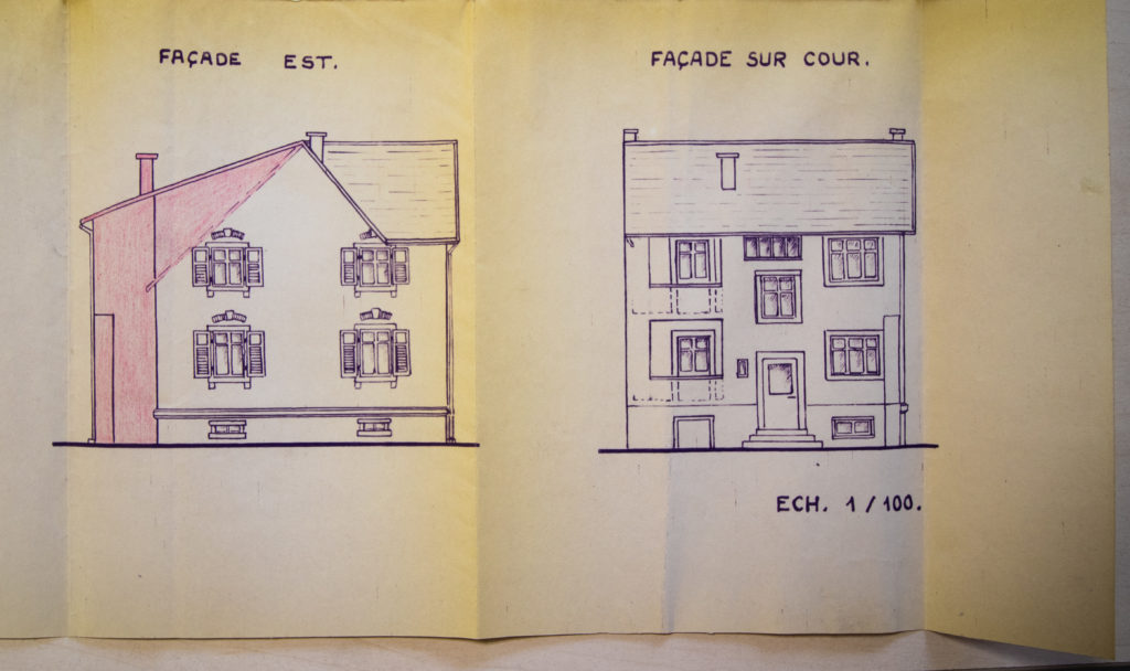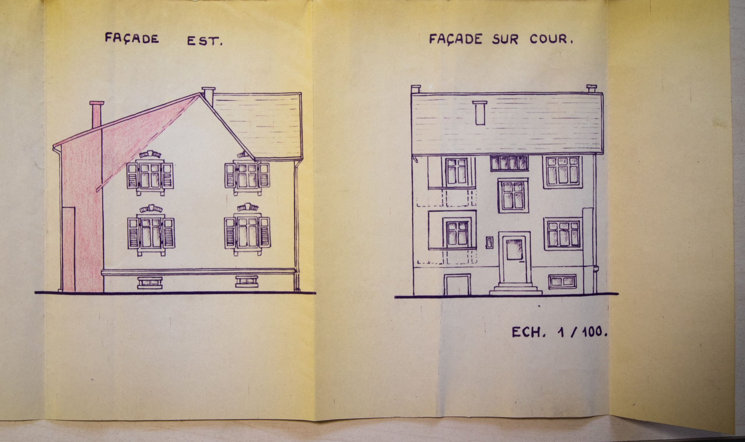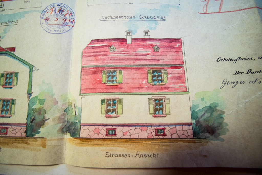 Quoi de mieux que de prendre rendez-vous auprès de l’archiviste pour se rendre compte de l’historique d’une maison. Un dossier d’une quarantaine de pages tous traitant de la maison : projets, permis de construire, demande de travaux, autorisations et certificats… Une belle mine d’or d’information et… des plans dignes de tableaux en aquarelle ! Mais sur ce projet est inscrit « nicht aus gericht » n’a pas été réalisé. En effet, la maison en est tout autre mais on reconnait quand même quelques ressemblances, à commencer par la façade Est et Nord.