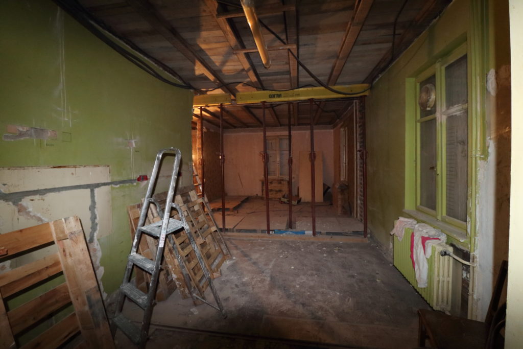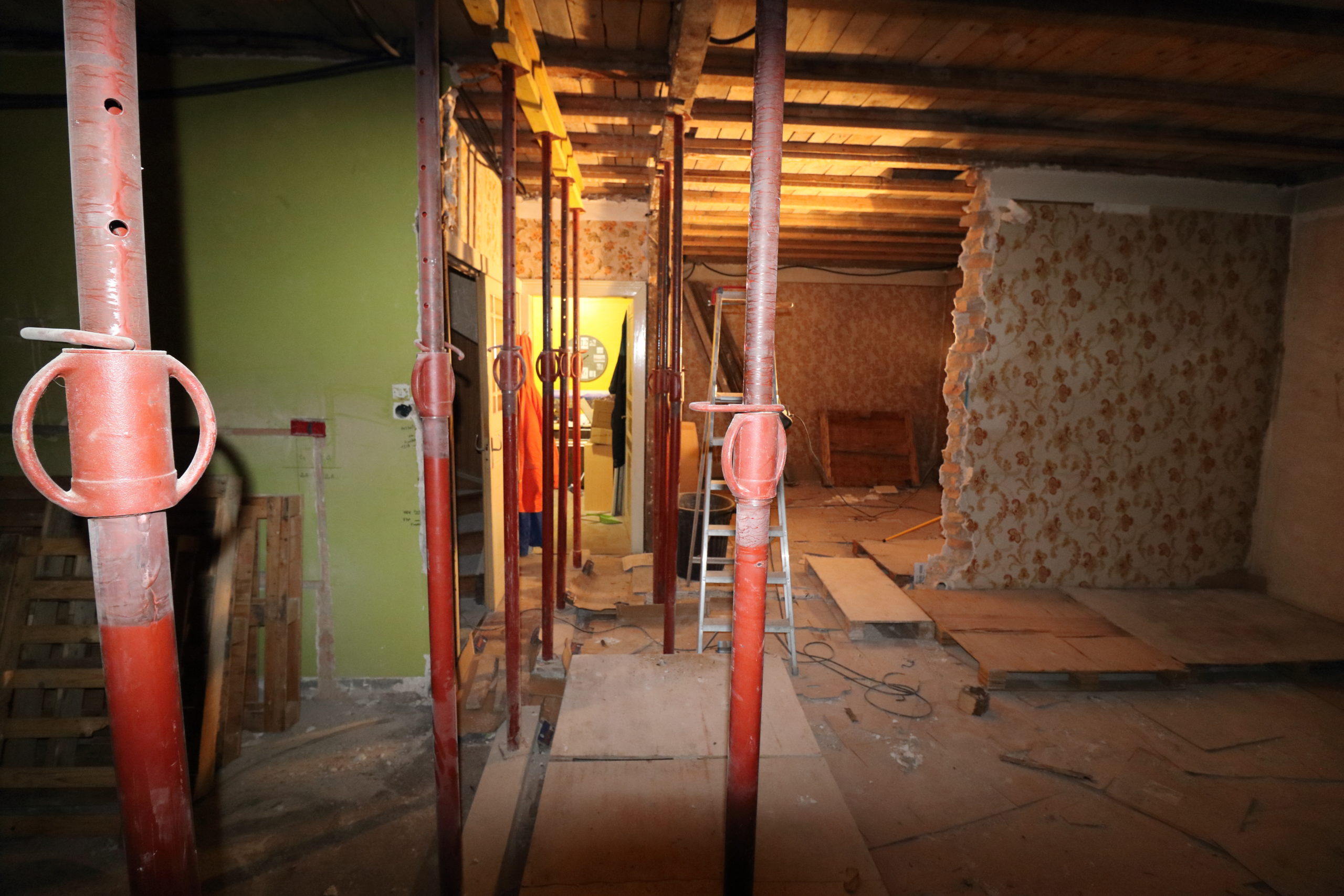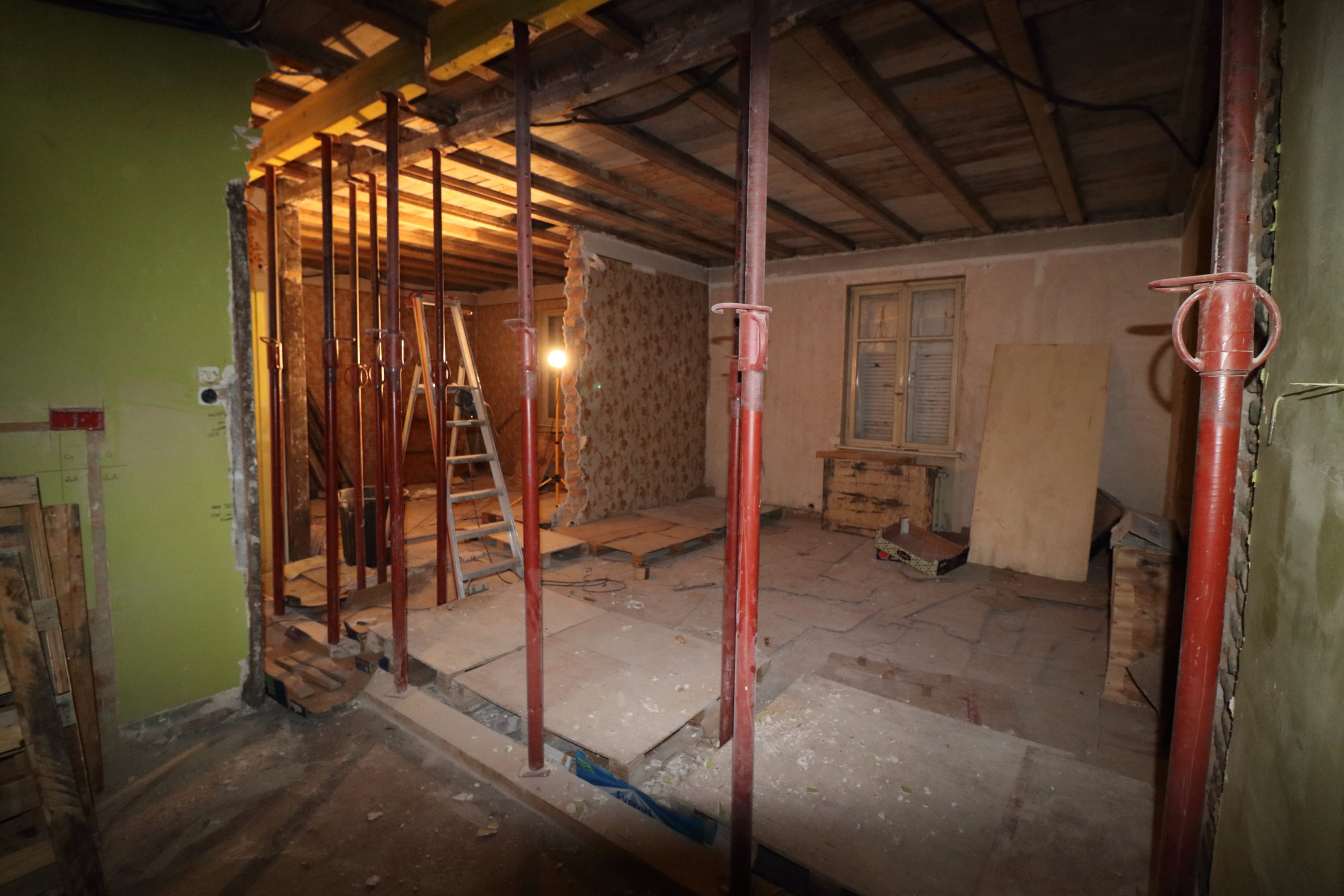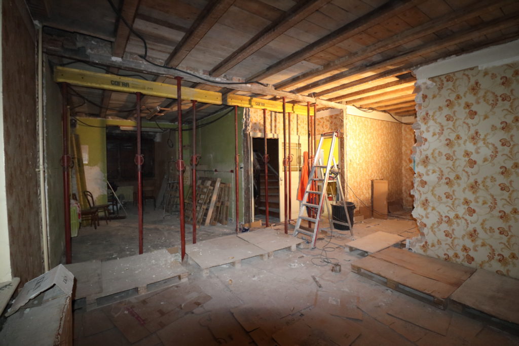 Découpage des poteaux en bois entre le salon et la cuisine et remplacement par des étais d’ici la pause de la poutre