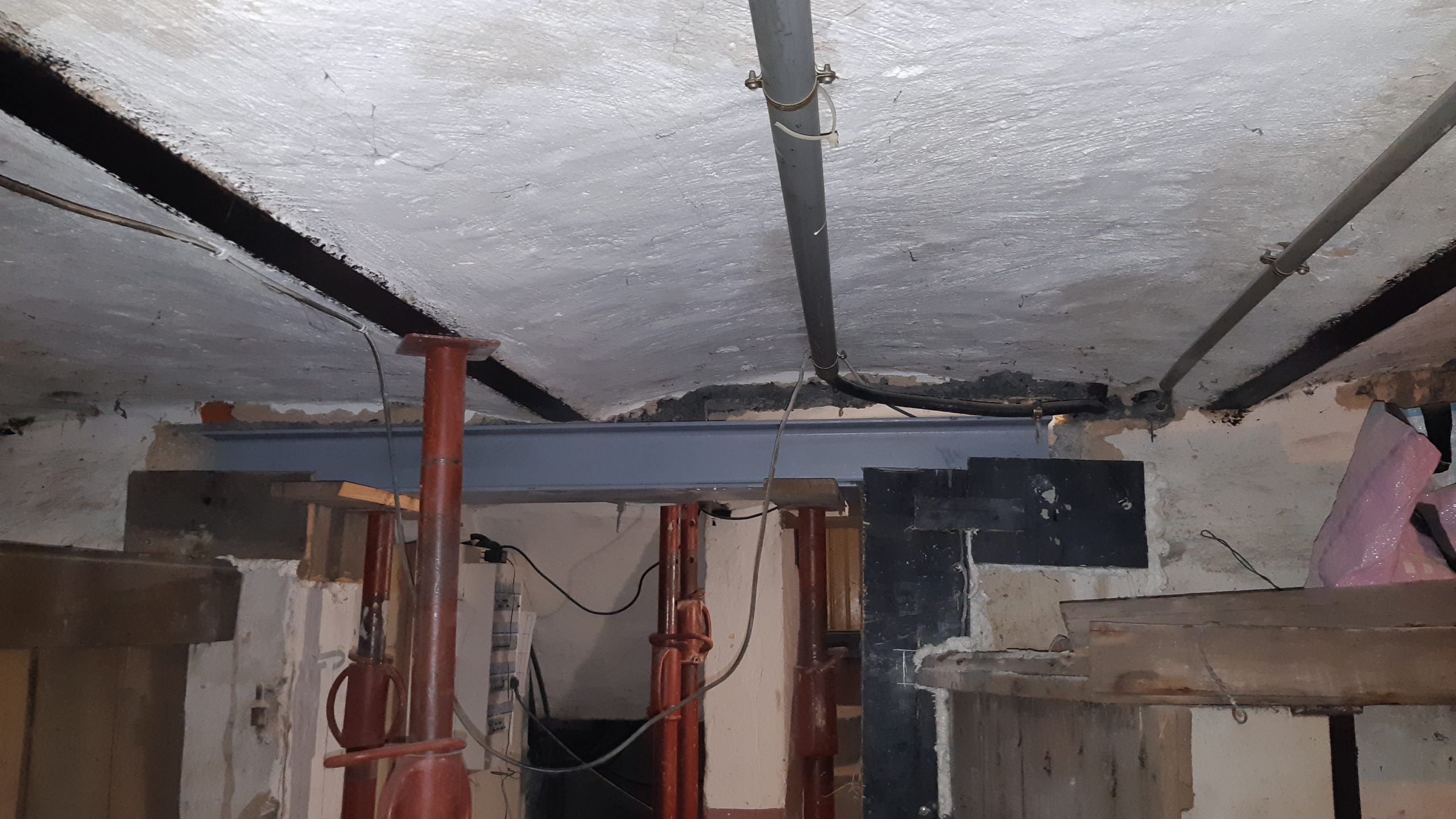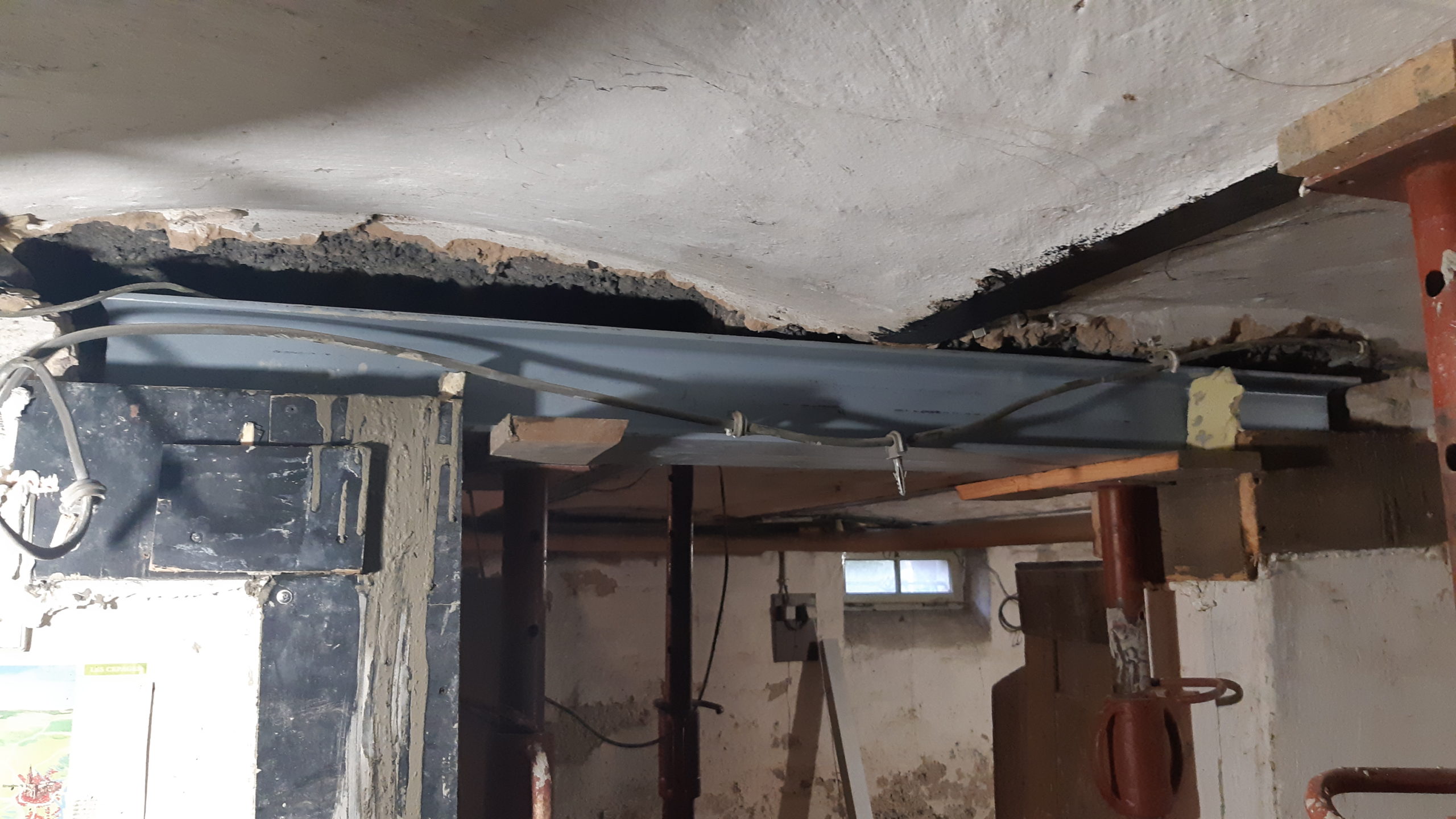 Remplacement de la poutre du sous-sol au dessus de la porte de la cave. Coupure du dernier poteau dans la salon pour préparer la grande poutre qui arrivera demain.
