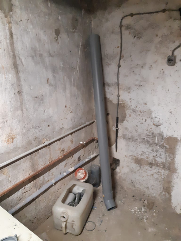 Installation du tuyau d’évacuation, diamètre 50, pour l’éviter et le lave-vaisselle. Préparation pour le raccordement sur un diamètre 100.