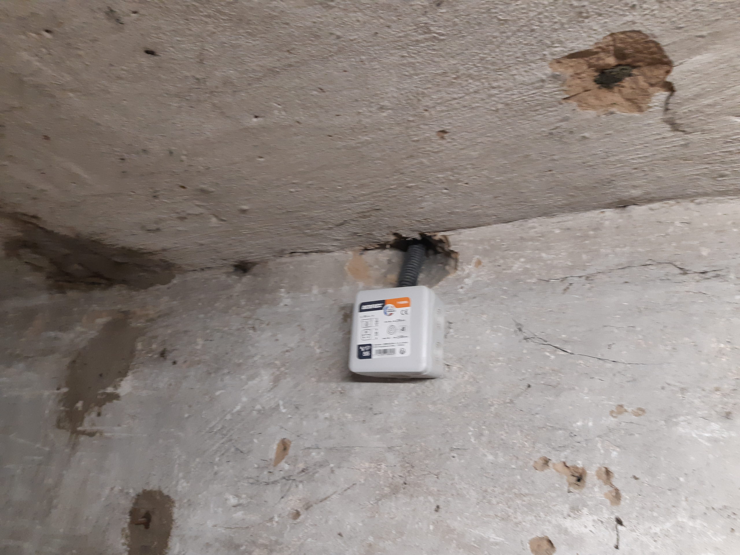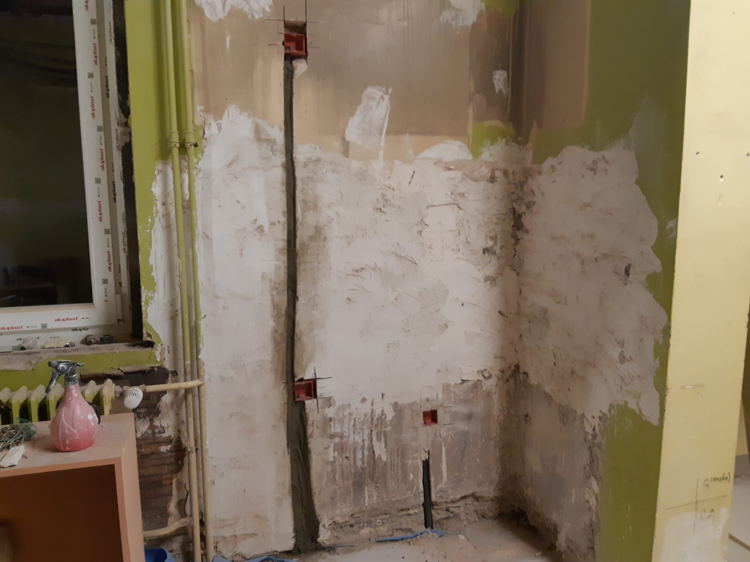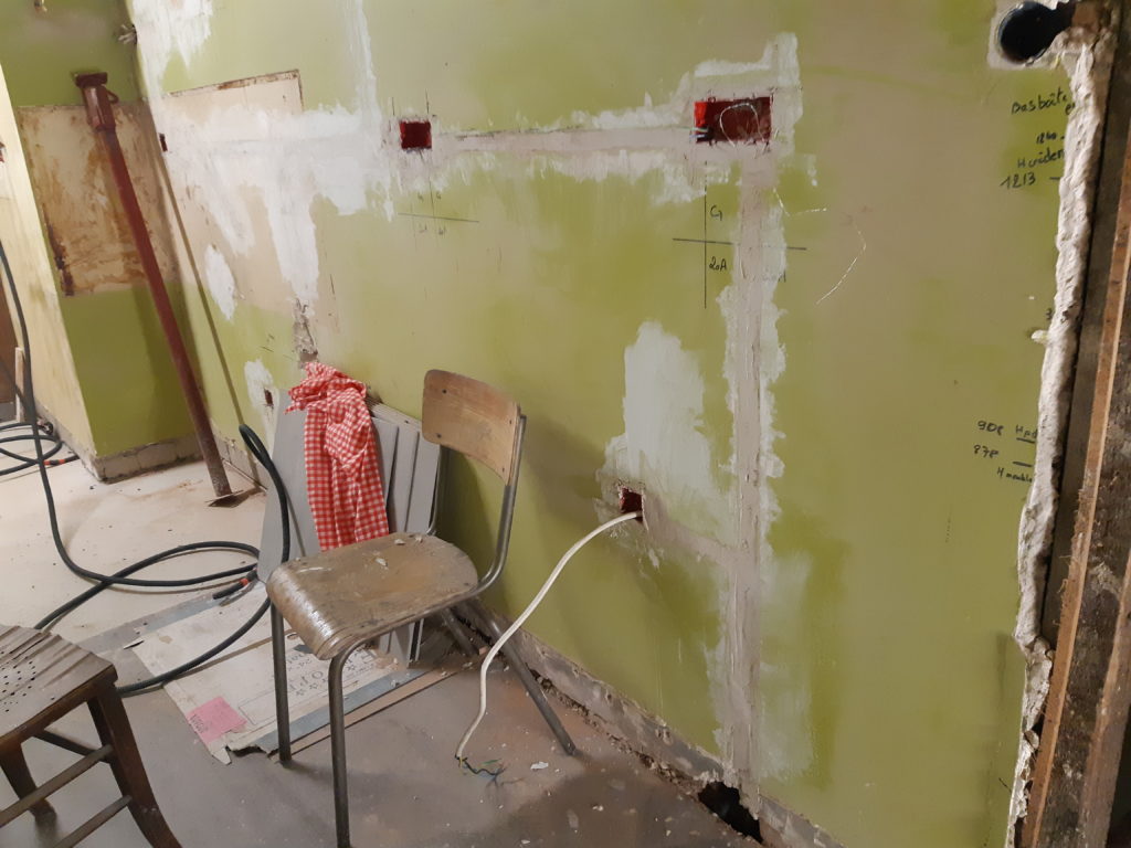 Suite d’hier avec le perçage des trous pour l’électricité de la cuisine, ce sont maintenant les derniers. Remplissage de béton une fois les gaines passées pour les trous, consolidations de certaines saignées et installation de boîtes de dérivation