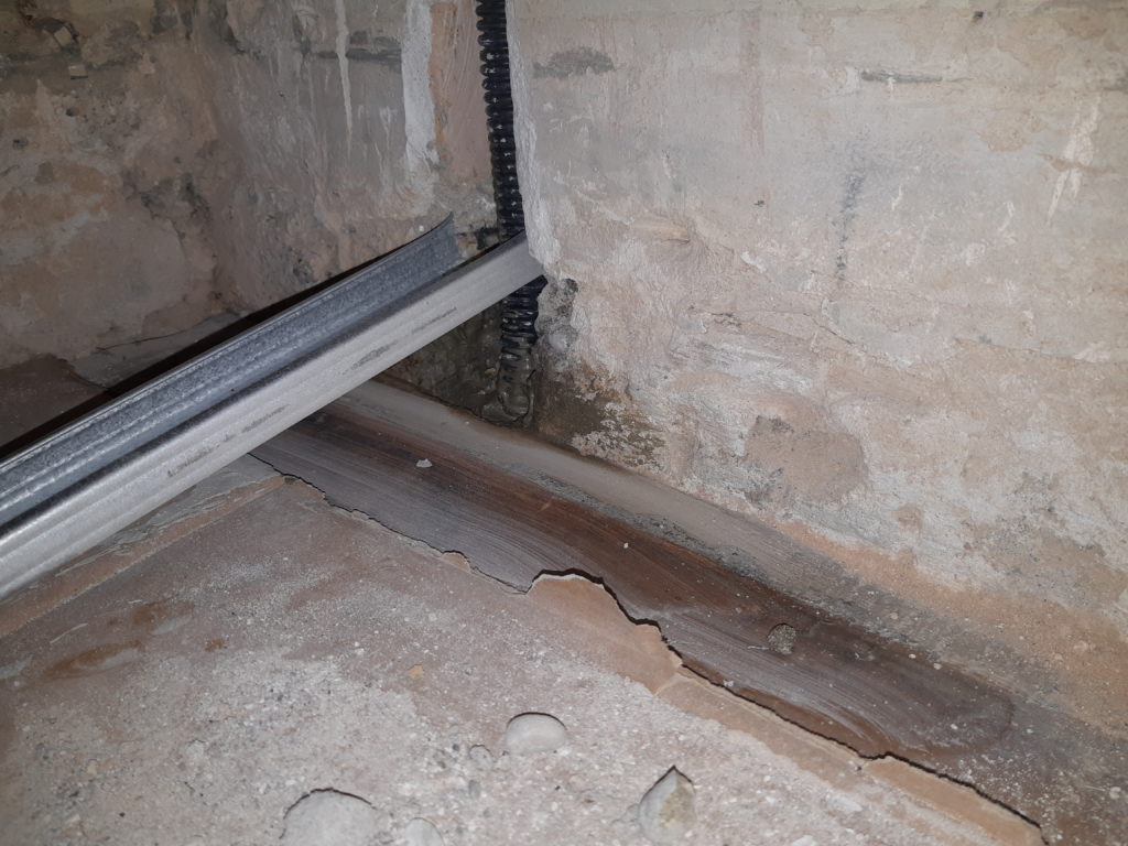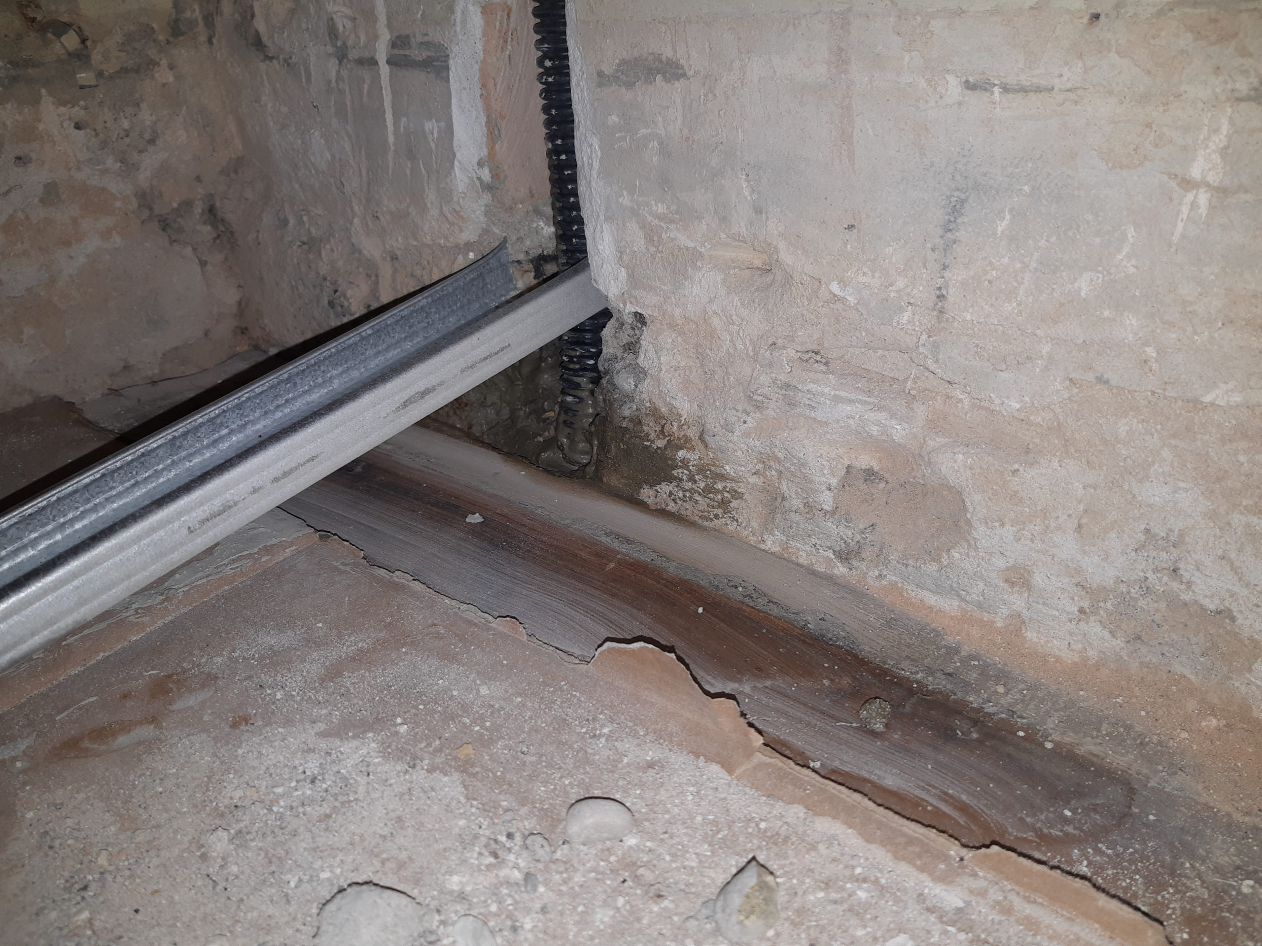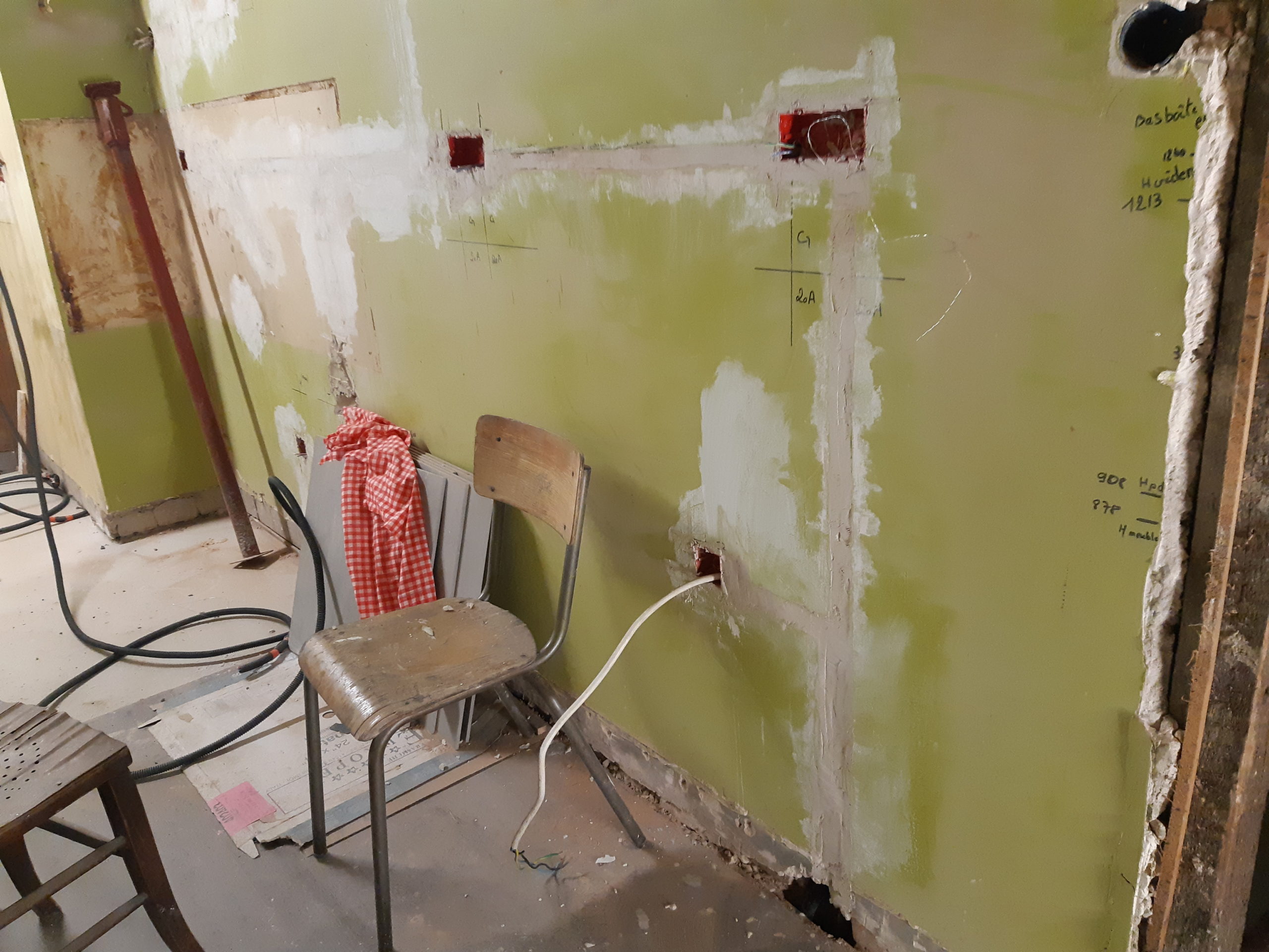 Suite d’hier avec le perçage des trous pour l’électricité de la cuisine, ce sont maintenant les derniers. Remplissage de béton une fois les gaines passées pour les trous, consolidations de certaines saignées et installation de boîtes de dérivation