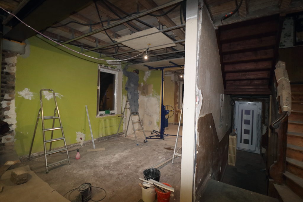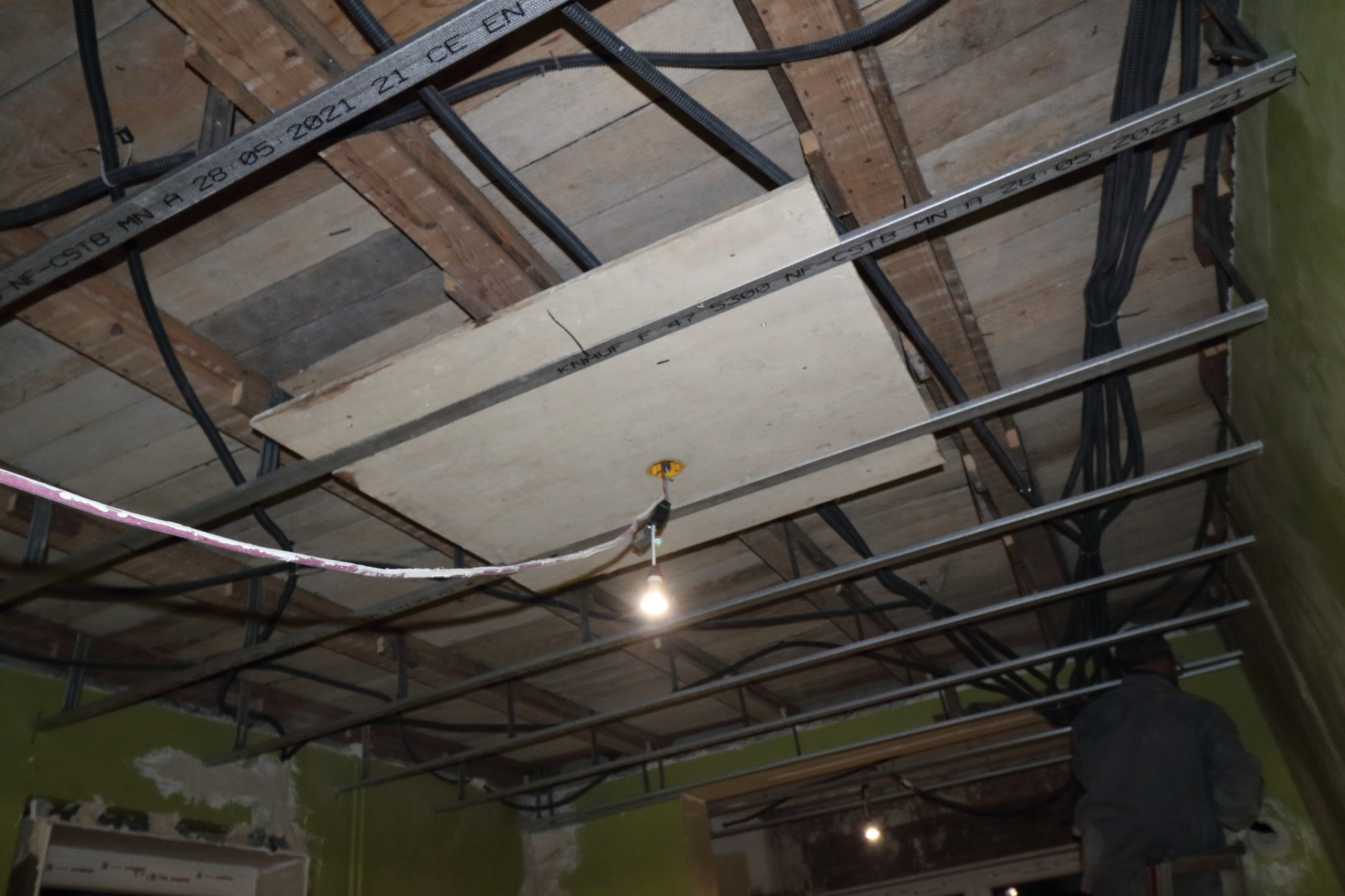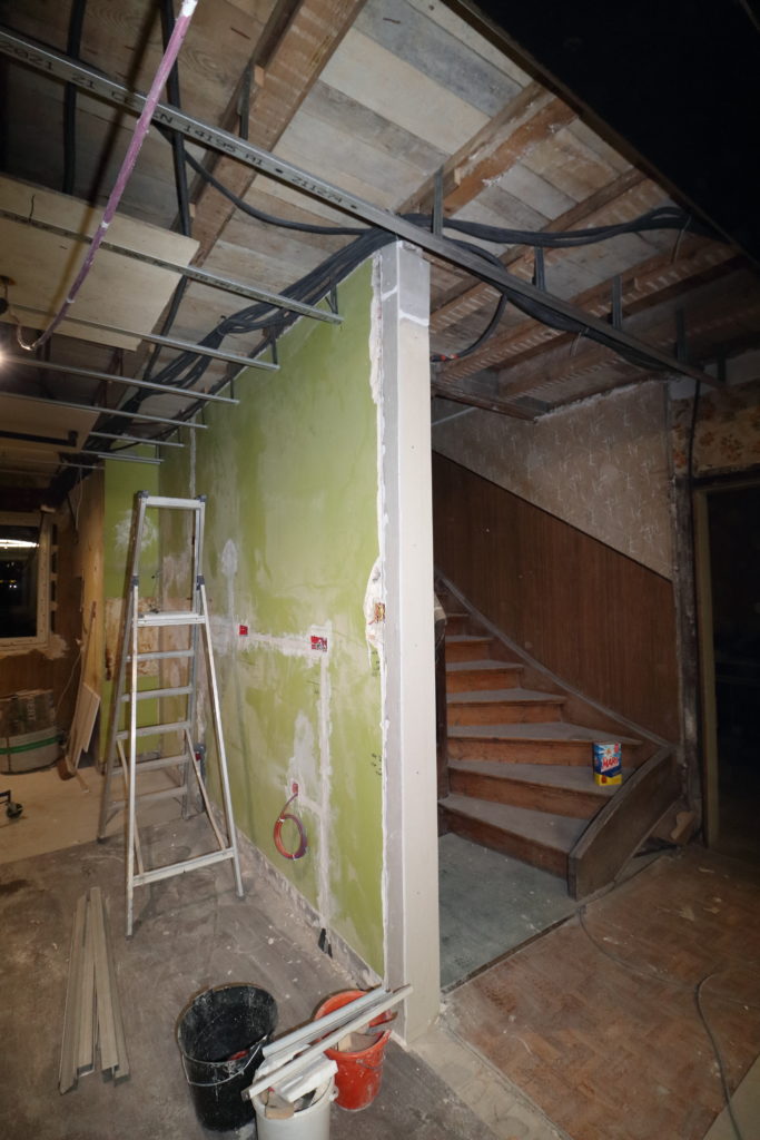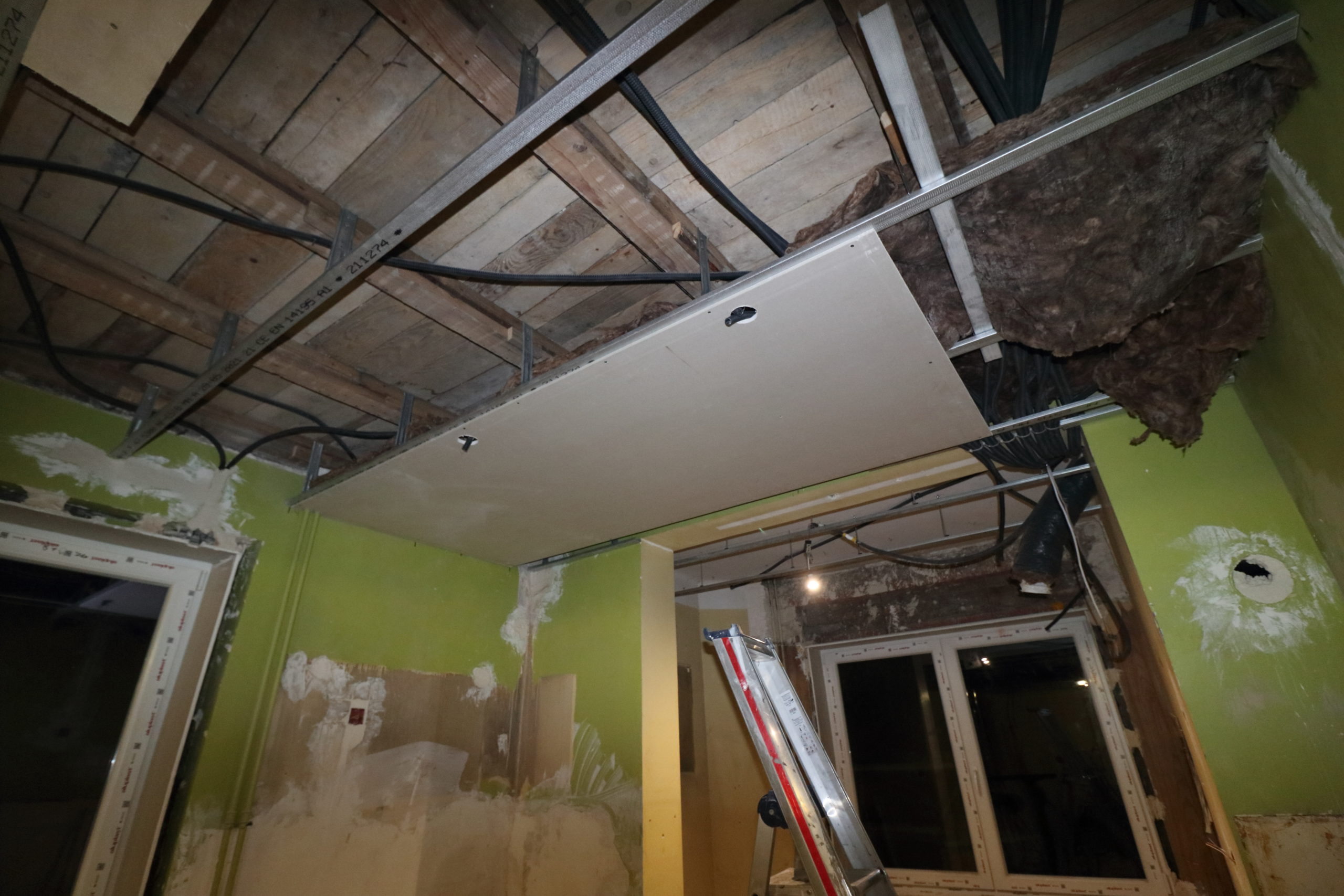Divers préparatifs avant d’engager la première plaque de plafond. Installation d’une plaque pour entour le poteau en bois entre l’escalier et la cuisine