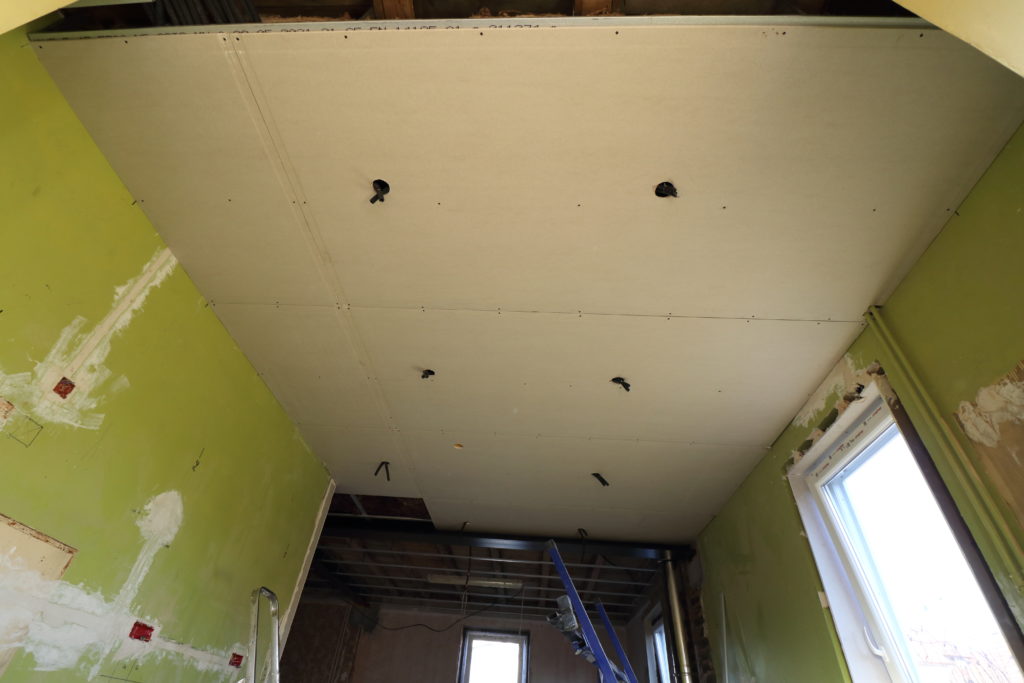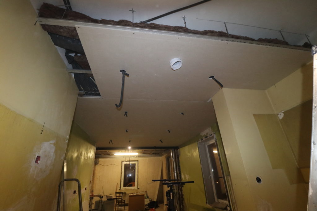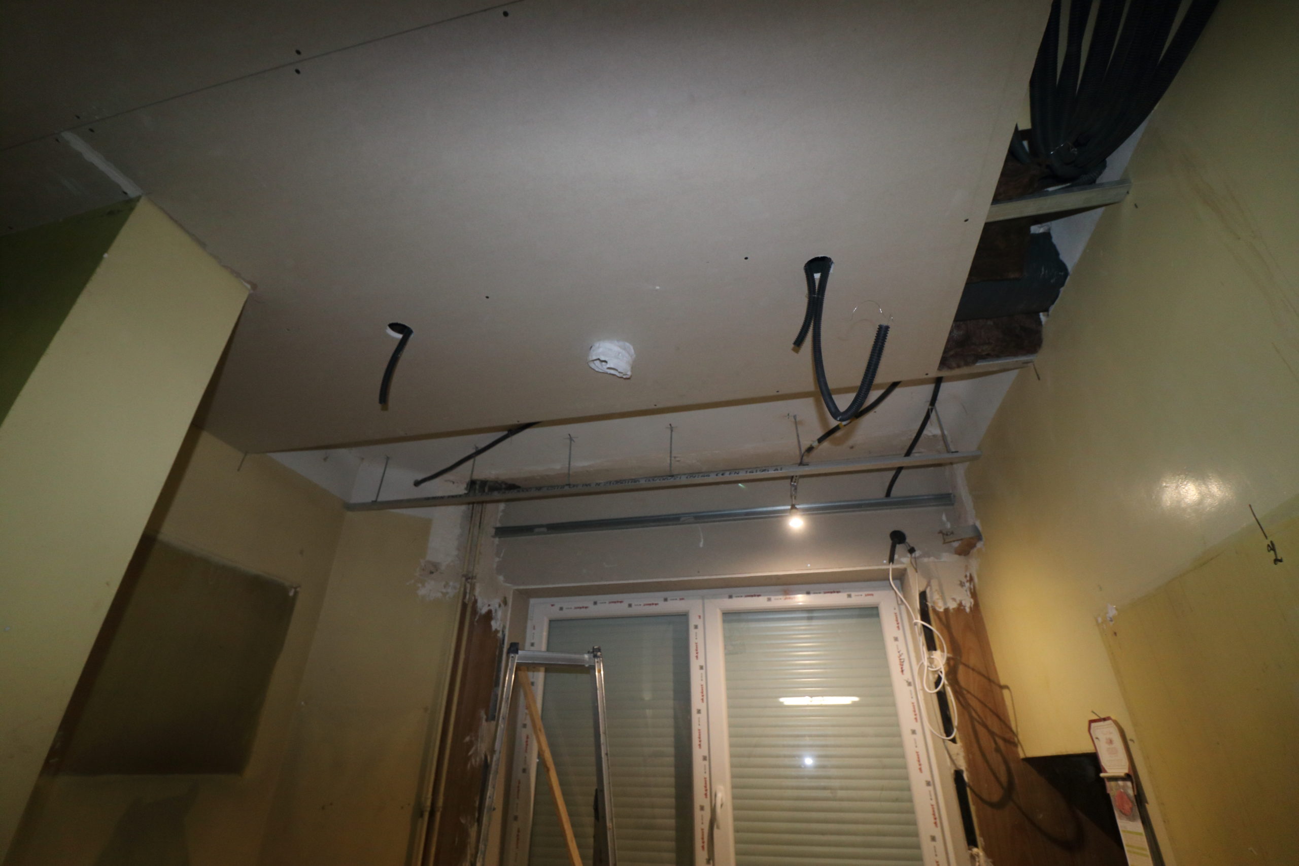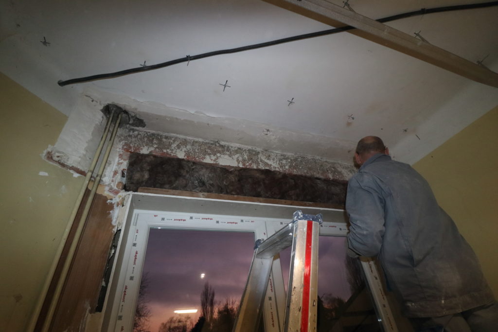 Fermeture du coffre de volet qui ne sert plus et remplissage avec de la laine de verre, fermeture avec un plaque de placo et mise en place de la dernière fourrure métallique qui supportera la dernière plaque dans son centre