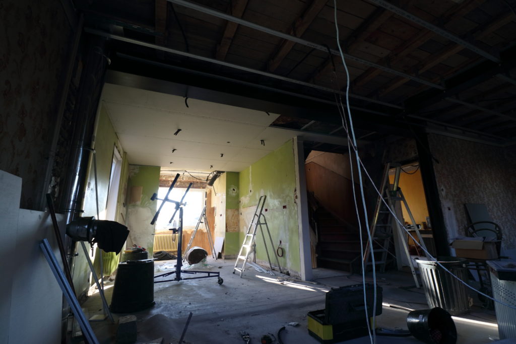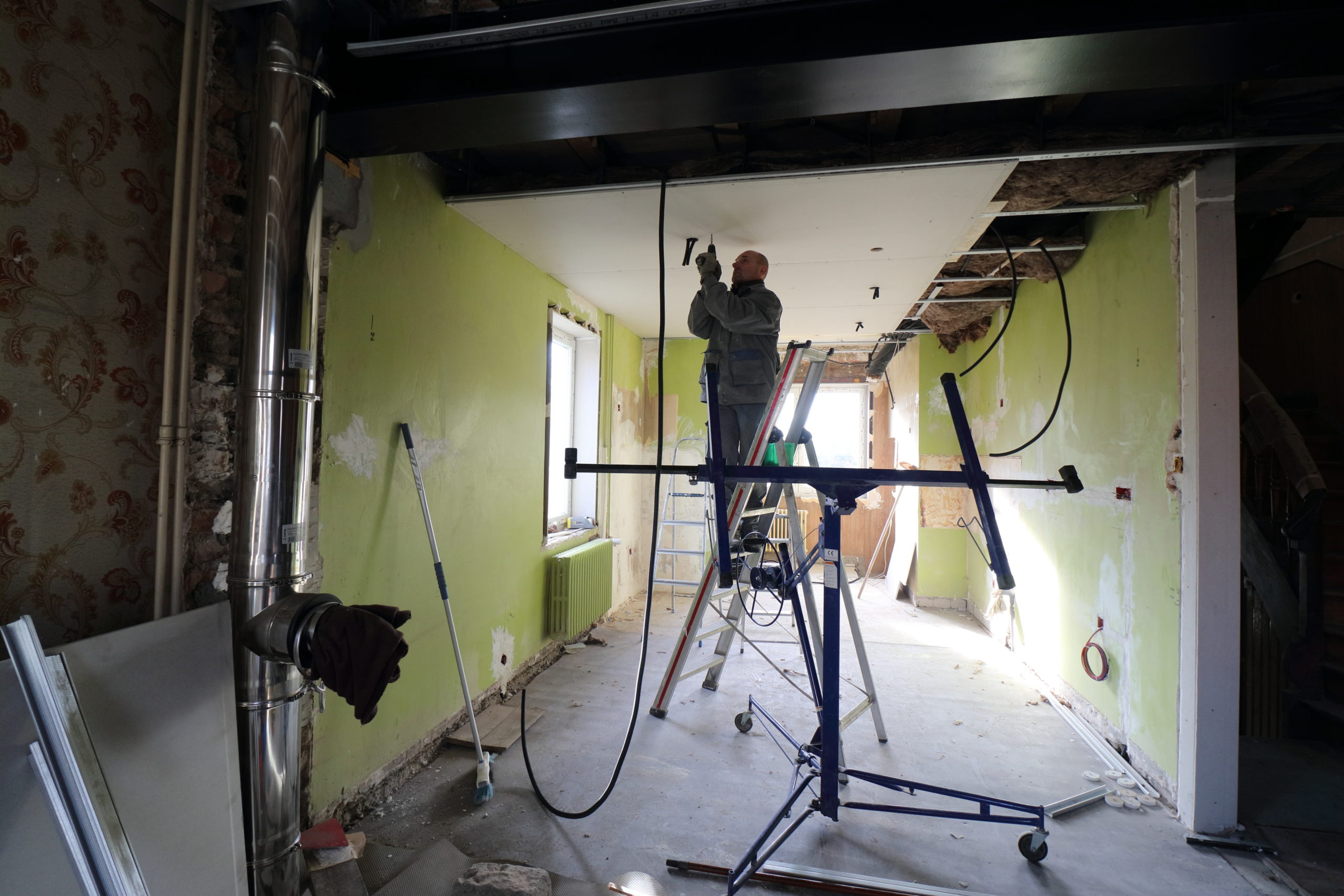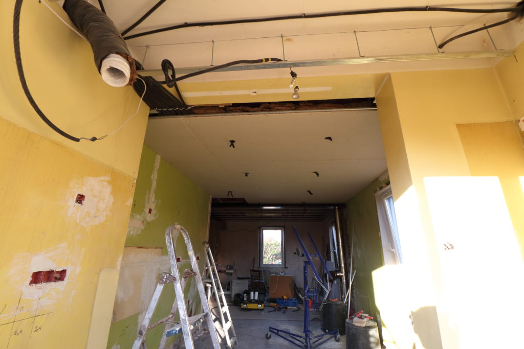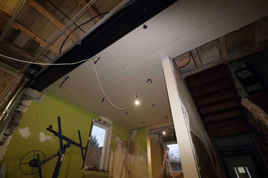 Fermeture du coffre de volet qui ne sert plus et remplissage avec de la laine de verre, fermeture avec un plaque de placo et mise en place de la dernière fourrure métallique qui supportera la dernière plaque dans son centre
