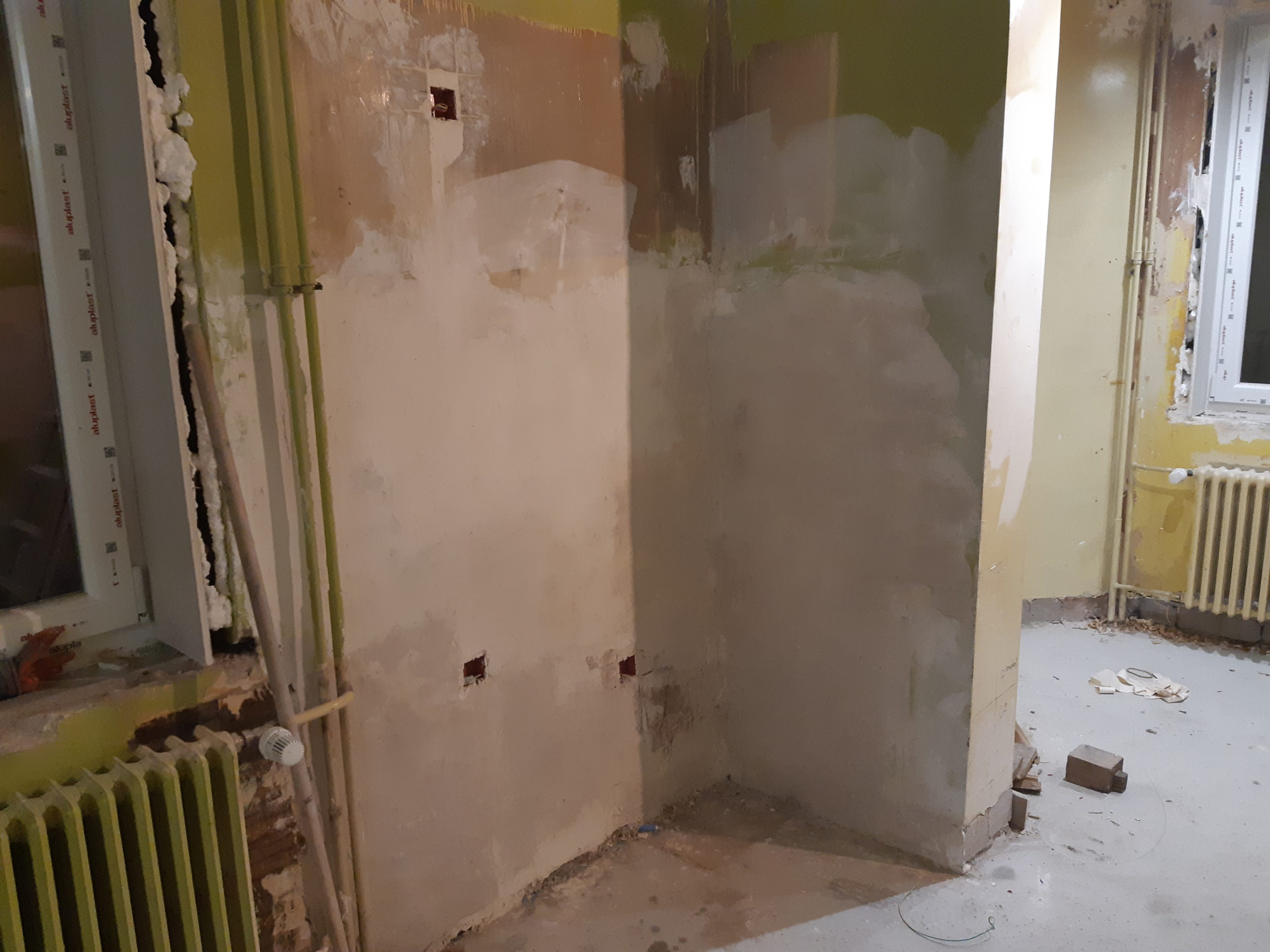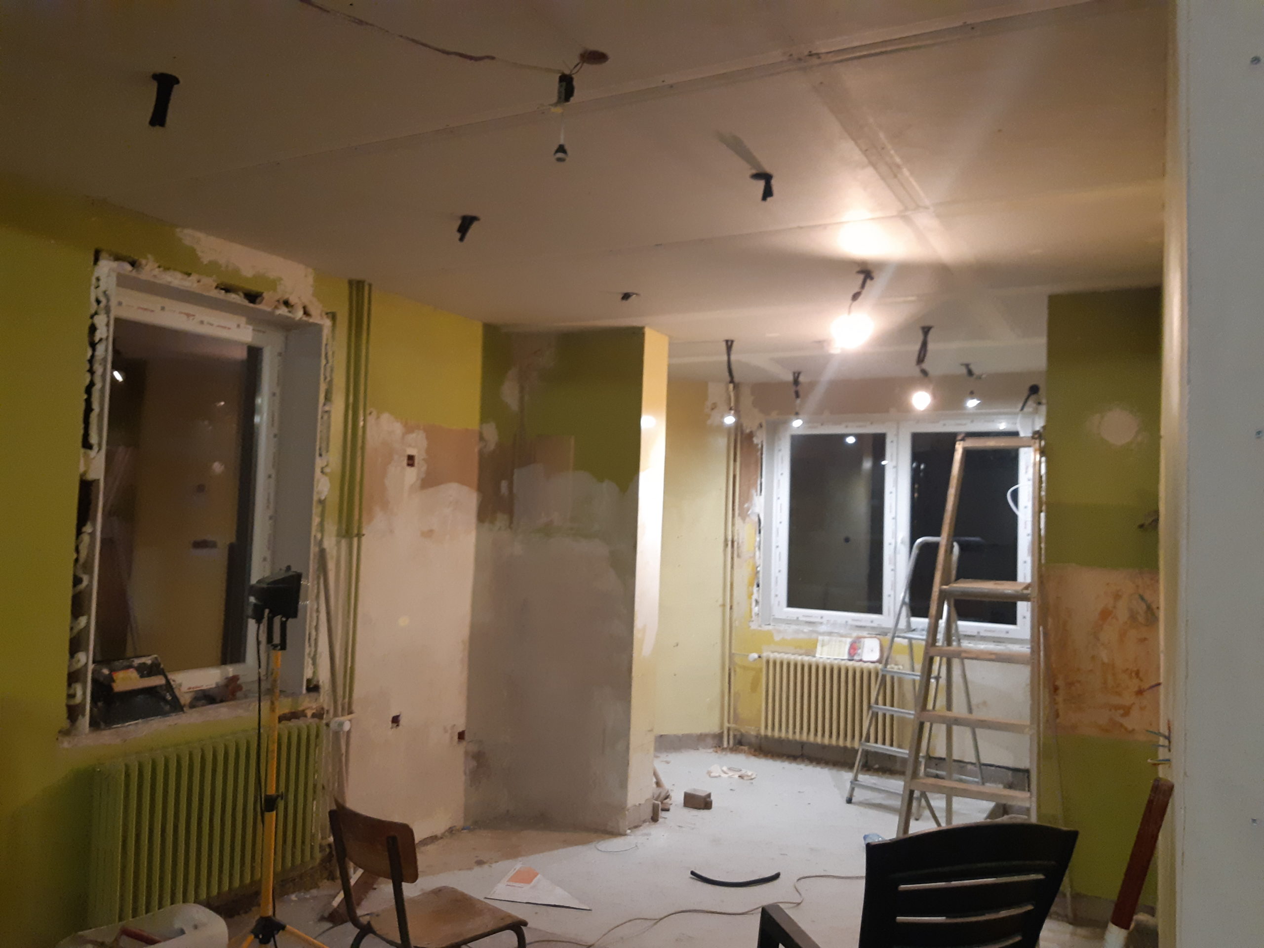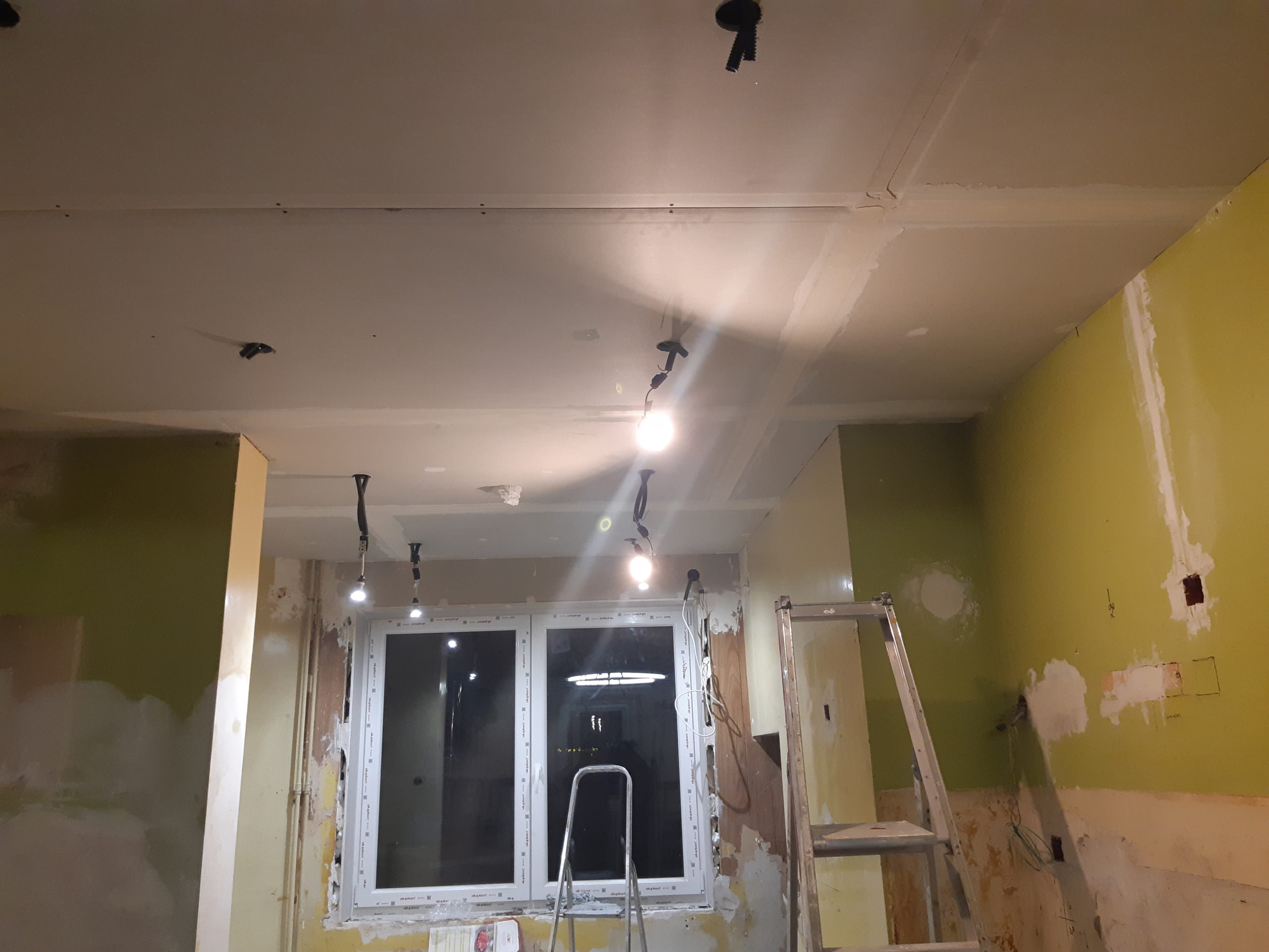 Du platre dans la cuisine pour finir le côté four. Début des bandes à placo pour le plafond et installation d’un peu plus d’éclairages