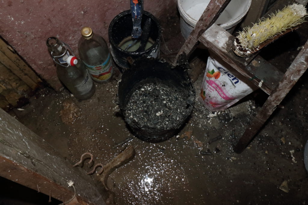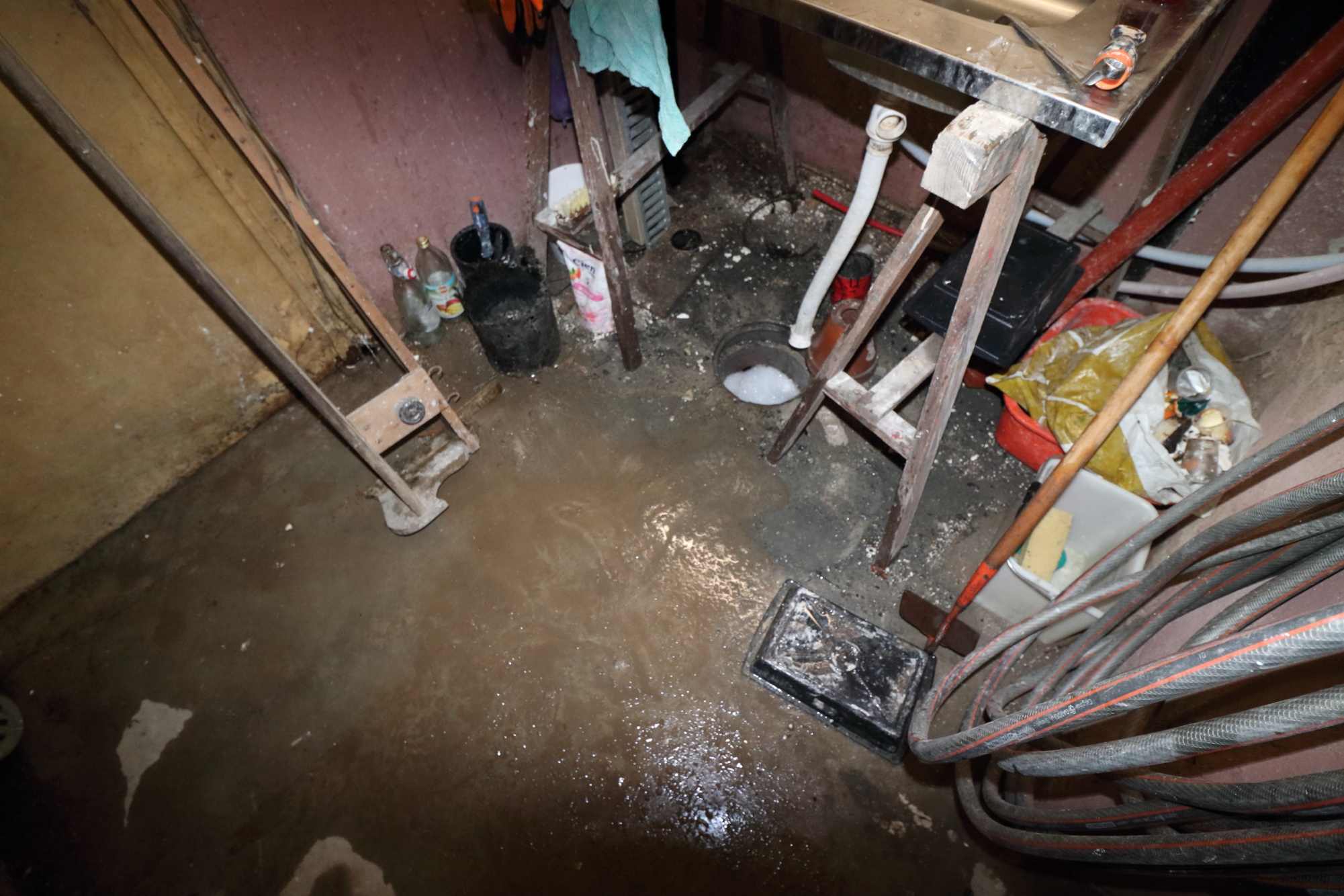 Débordement d’égout à la cave en arrivant suite à la pluie. Mise en route de la pompe à eau et transvasement de sceaux dans le regard directement. Au bout de quelques 5-6 sceaux, on voit le fond de l’égout. Le reste à main… Quel plaisir…