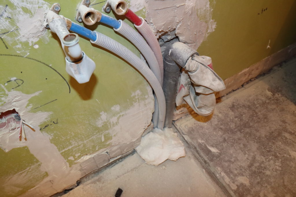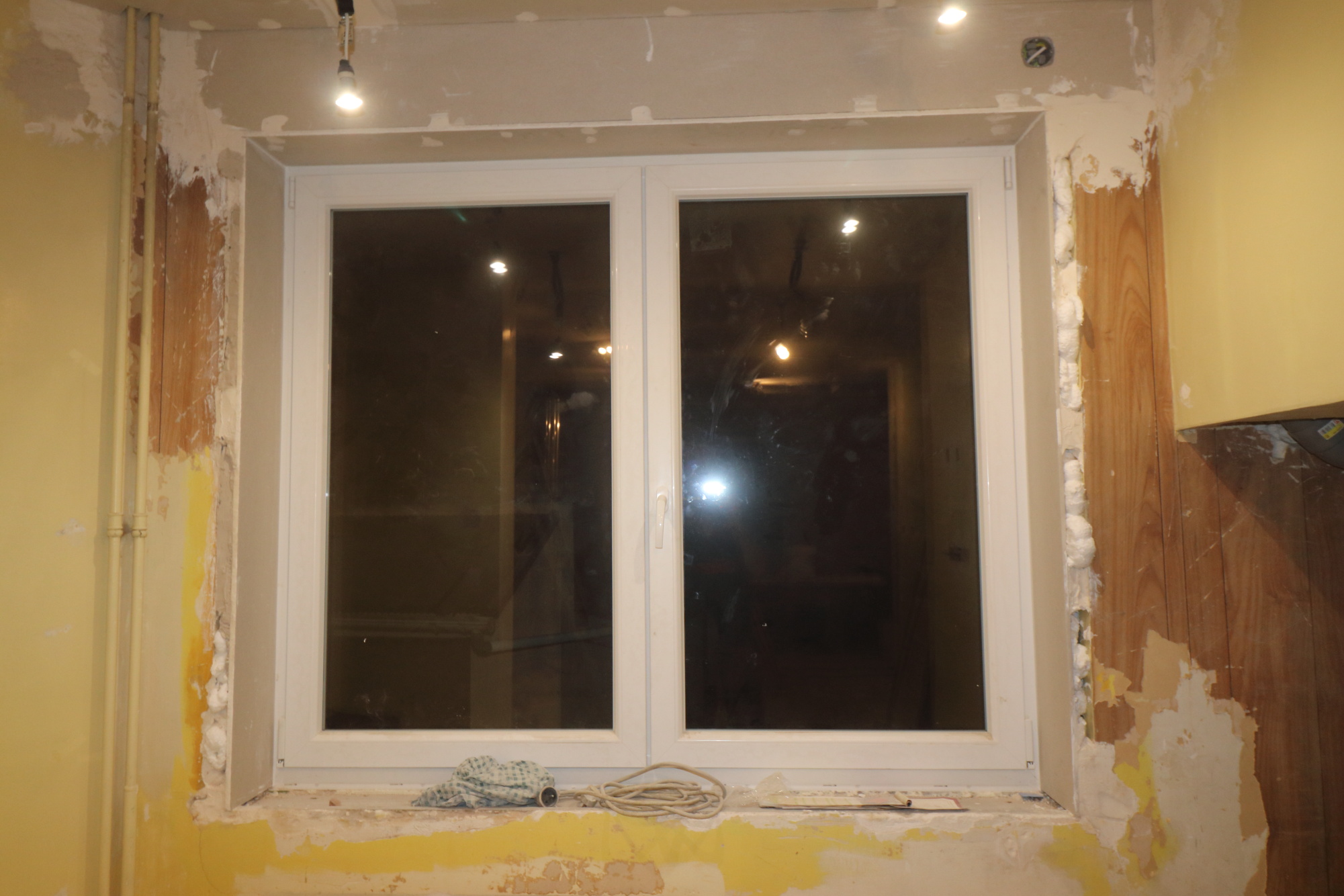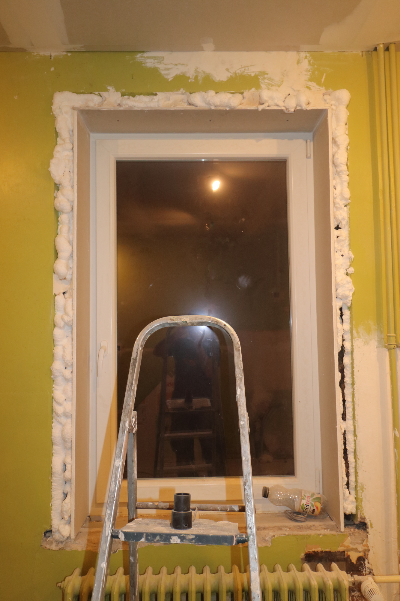Ainsi que des murs et bouchage des anciennes boites électriques. Mise en place de la mousse expansive dans les trous et autour des fenêtres. Ponçage des murs avec la machine à poncer