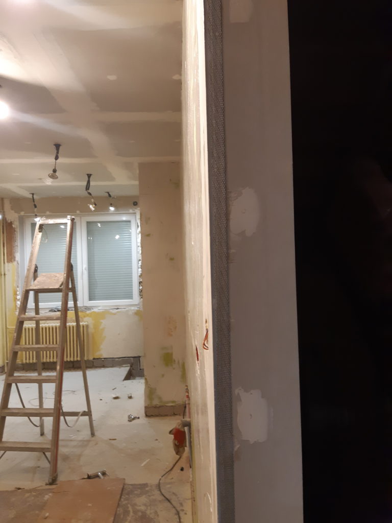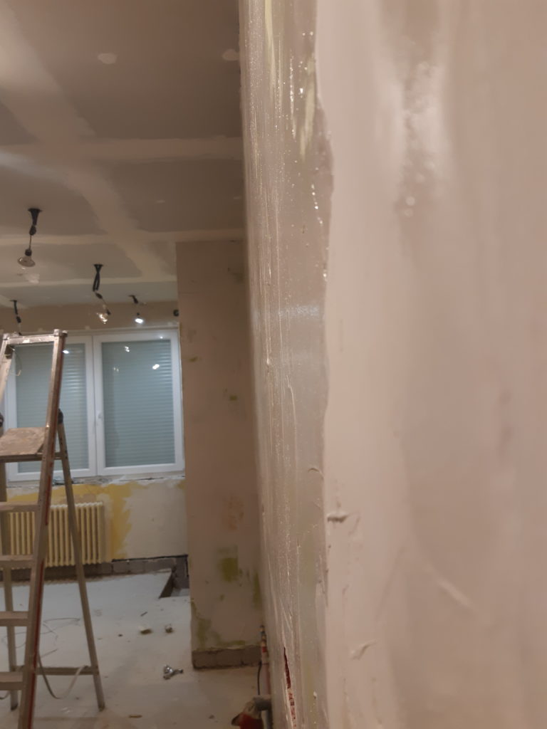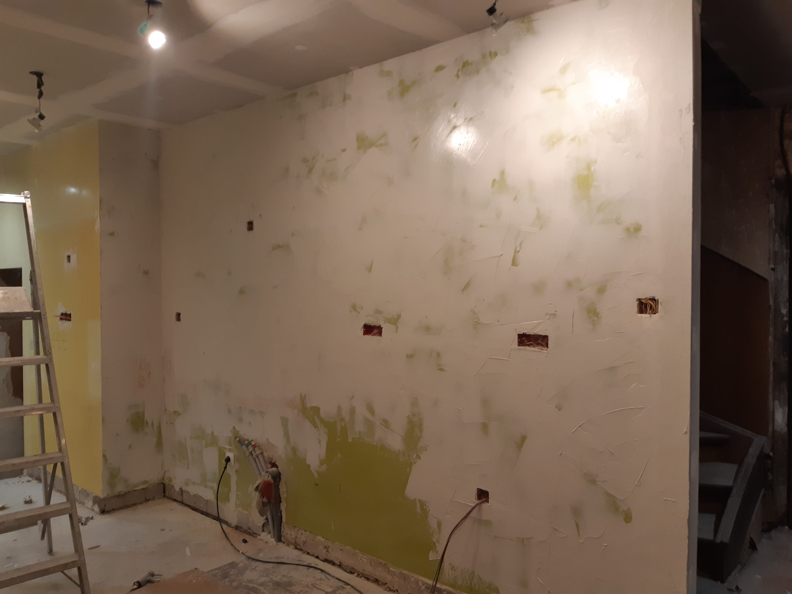 Ponçage des colles, passage d’un coup d’éponge sur le murs pour enlever le poussière et premiers enduits sur les murs de la cuisine. Quelques difficultés pour faire adhérer le produit sur la peinture bien que les murs aient été lessivés. A voir demain si ça tient bien et pour continuer le remplissage des zones encore vertes. Seule la partie inférieur gauche ne sera pas enduit car la cuisine recouvrira cet espace.