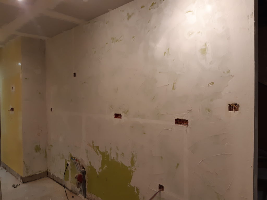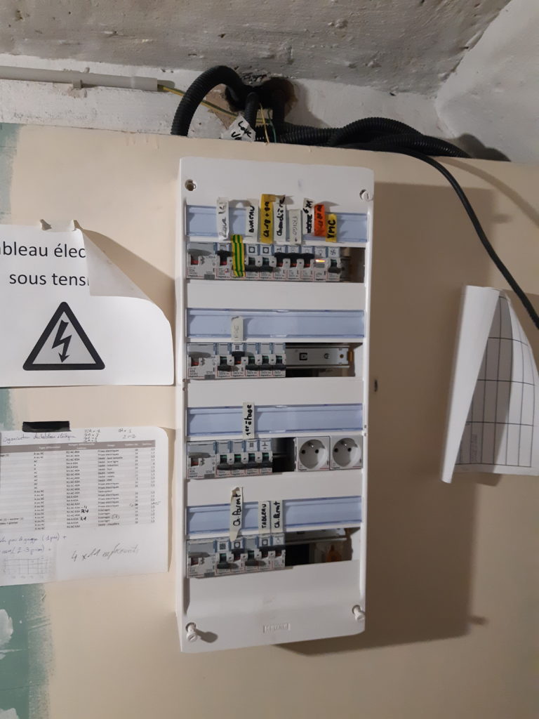 L’enduit d’hier étant pas encore sec, remplacement par l’électricité de la cuisine avec le raccordement d’un circuit de prises électriques