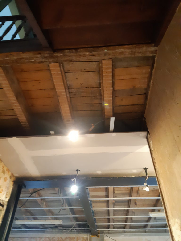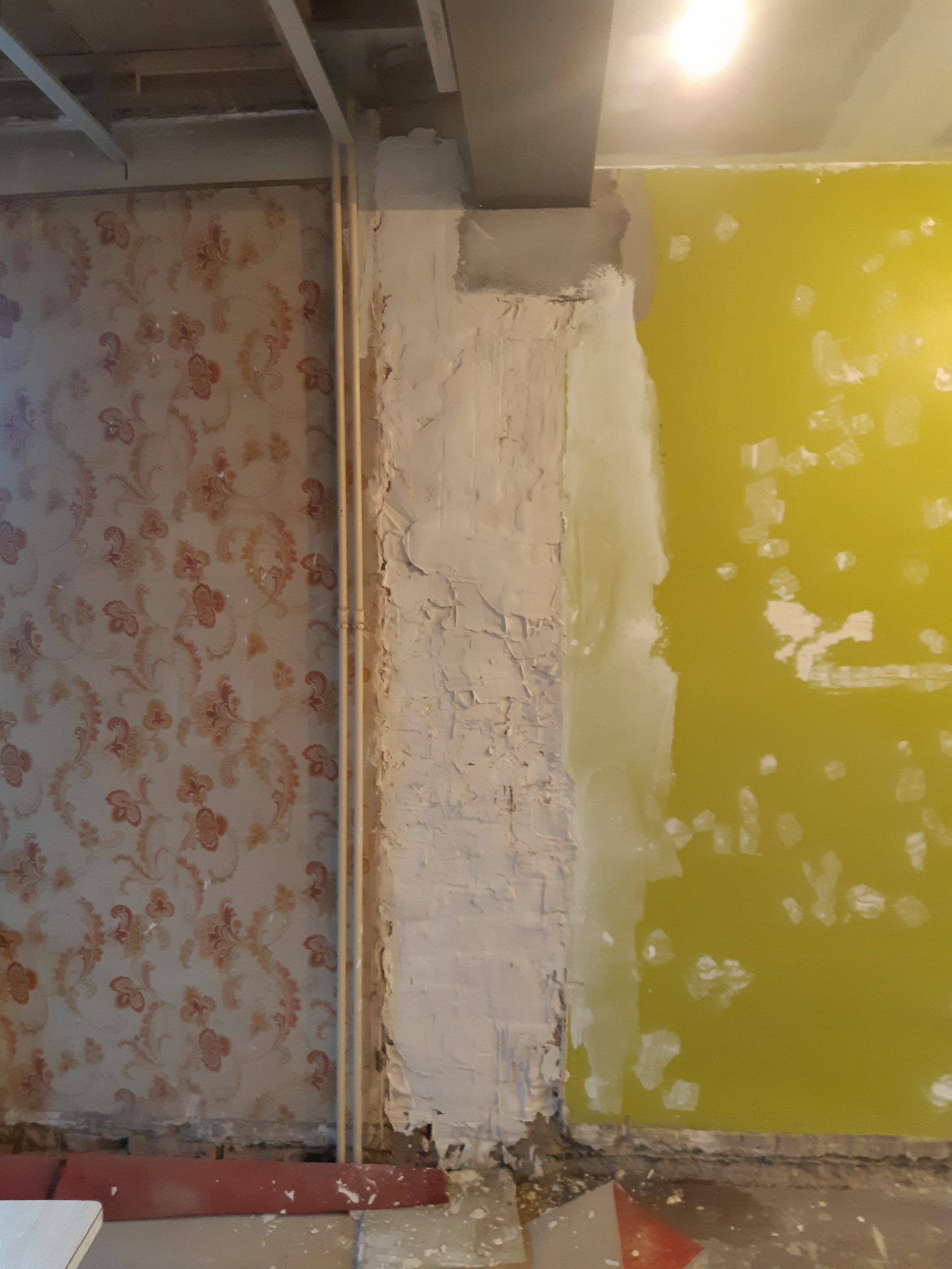 Démontage de la cheminée au RDC et première couche de plâtre sur le mur à l’arrière
