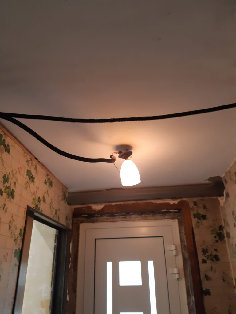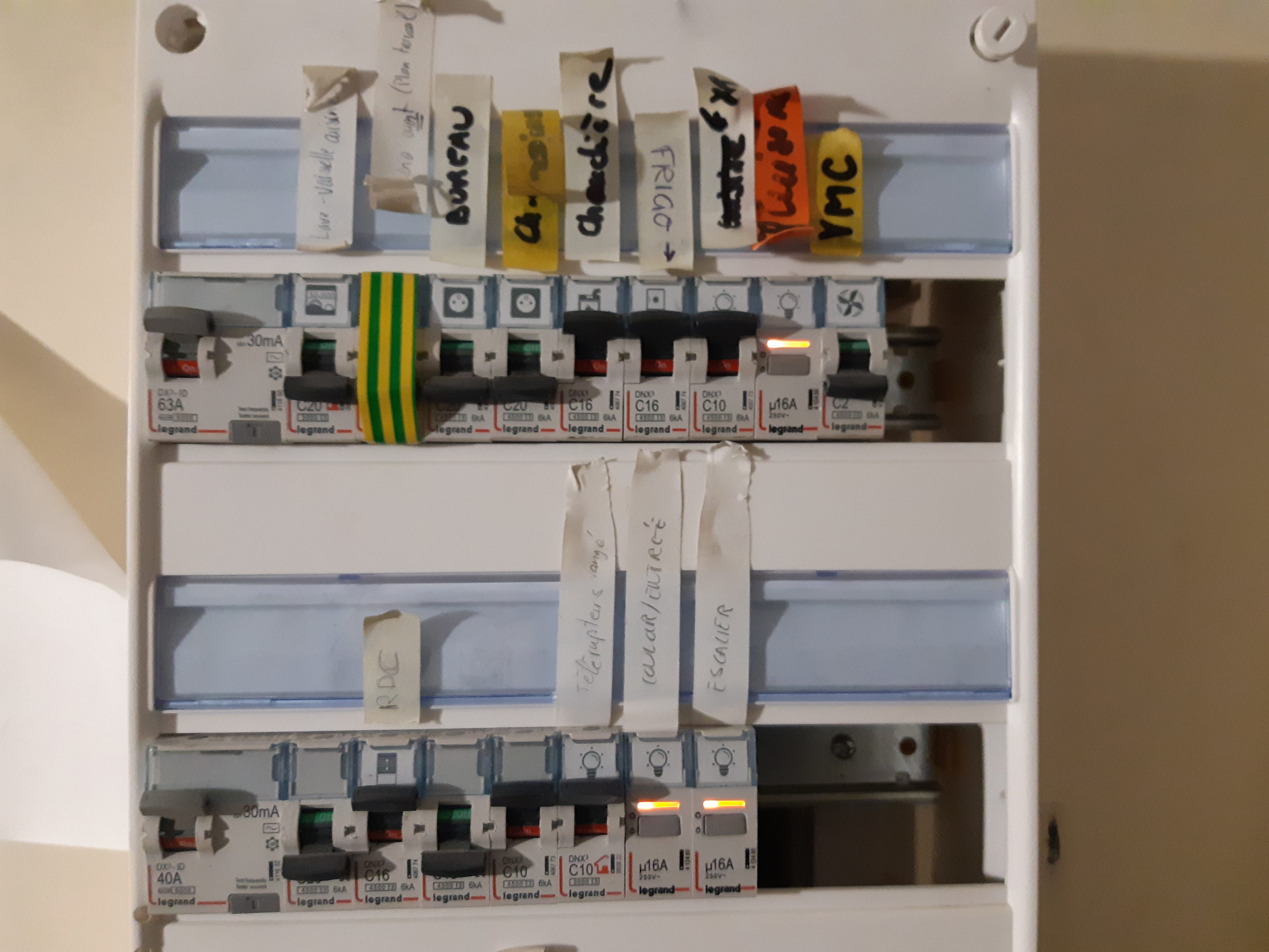 Installation et raccordement des télérupteurs mais sans les boutons poussoirs. Actionnable seulement depuis le tableau pour le moment. Permet de piloter l’éclairage de l’escalier et du couloir.