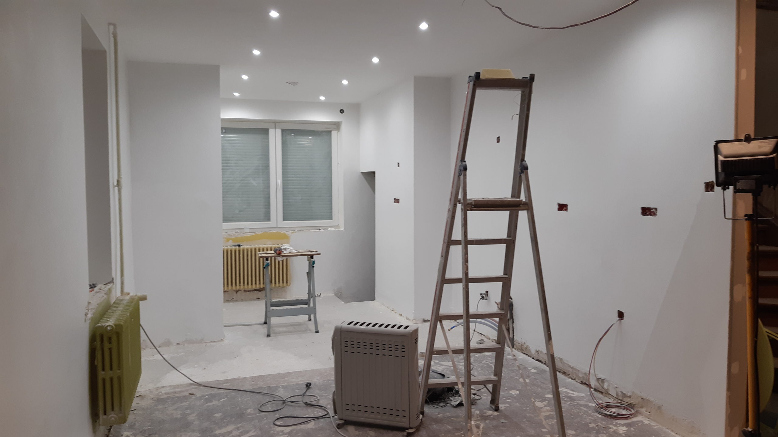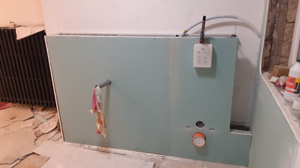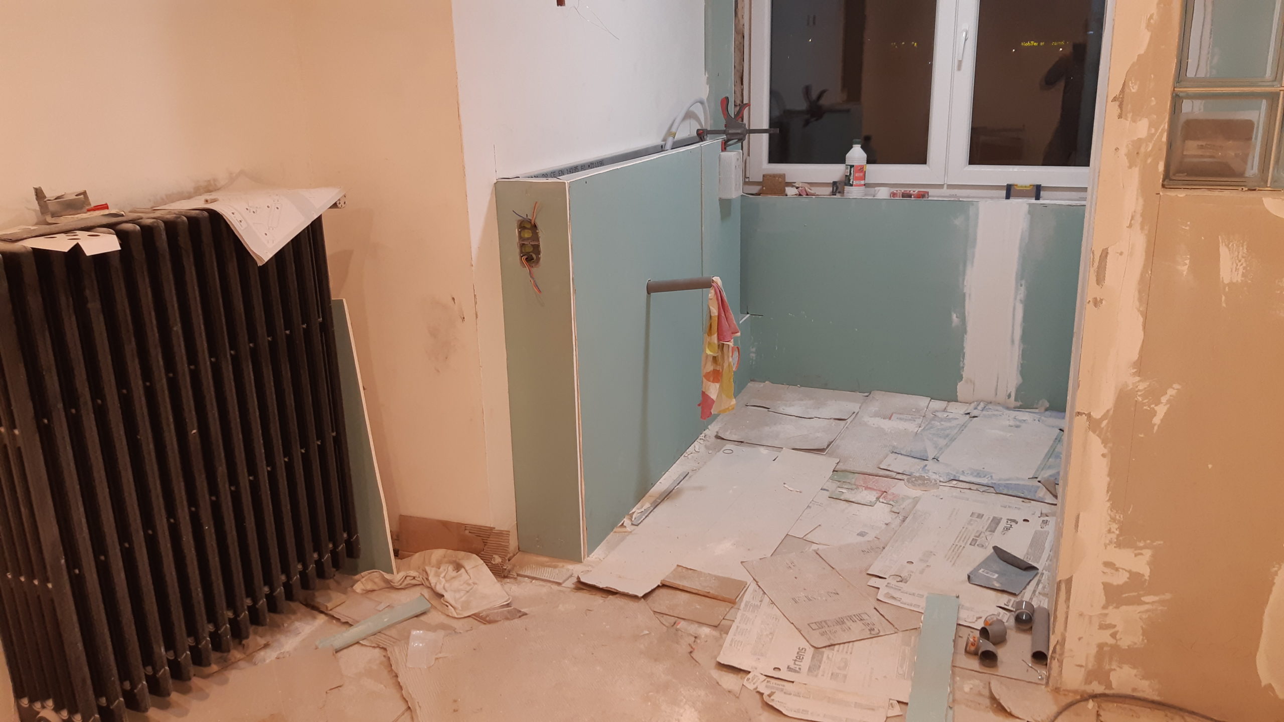 Réalisation du coffre dans la chambre qui accueillera la lavabo et WC. Tour en placo et renforts en bois à l’arrière pour que le lavabo tienne bien