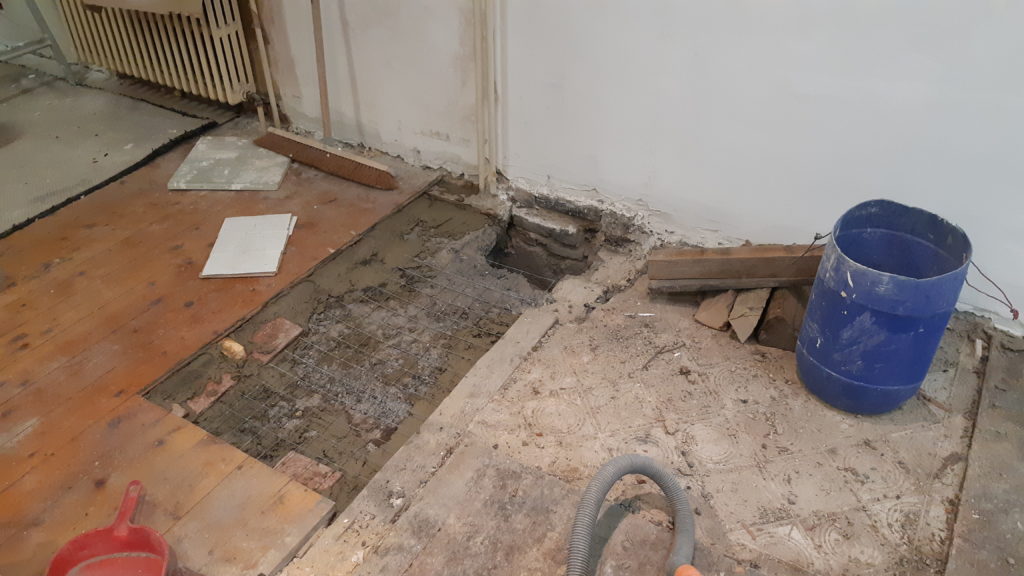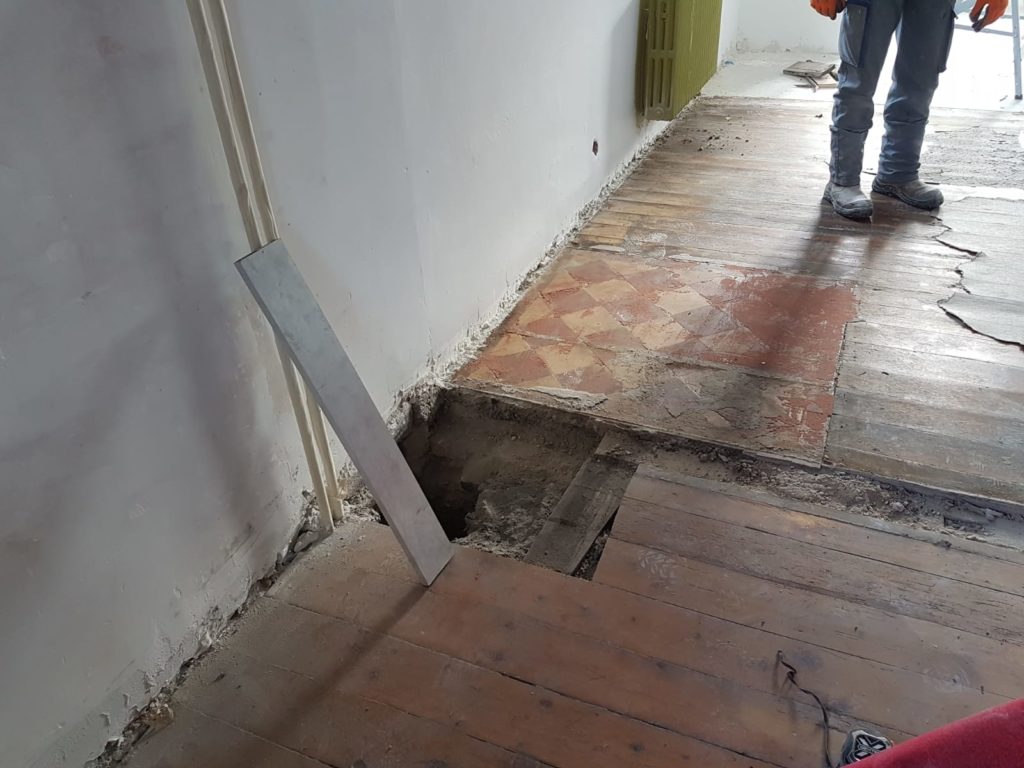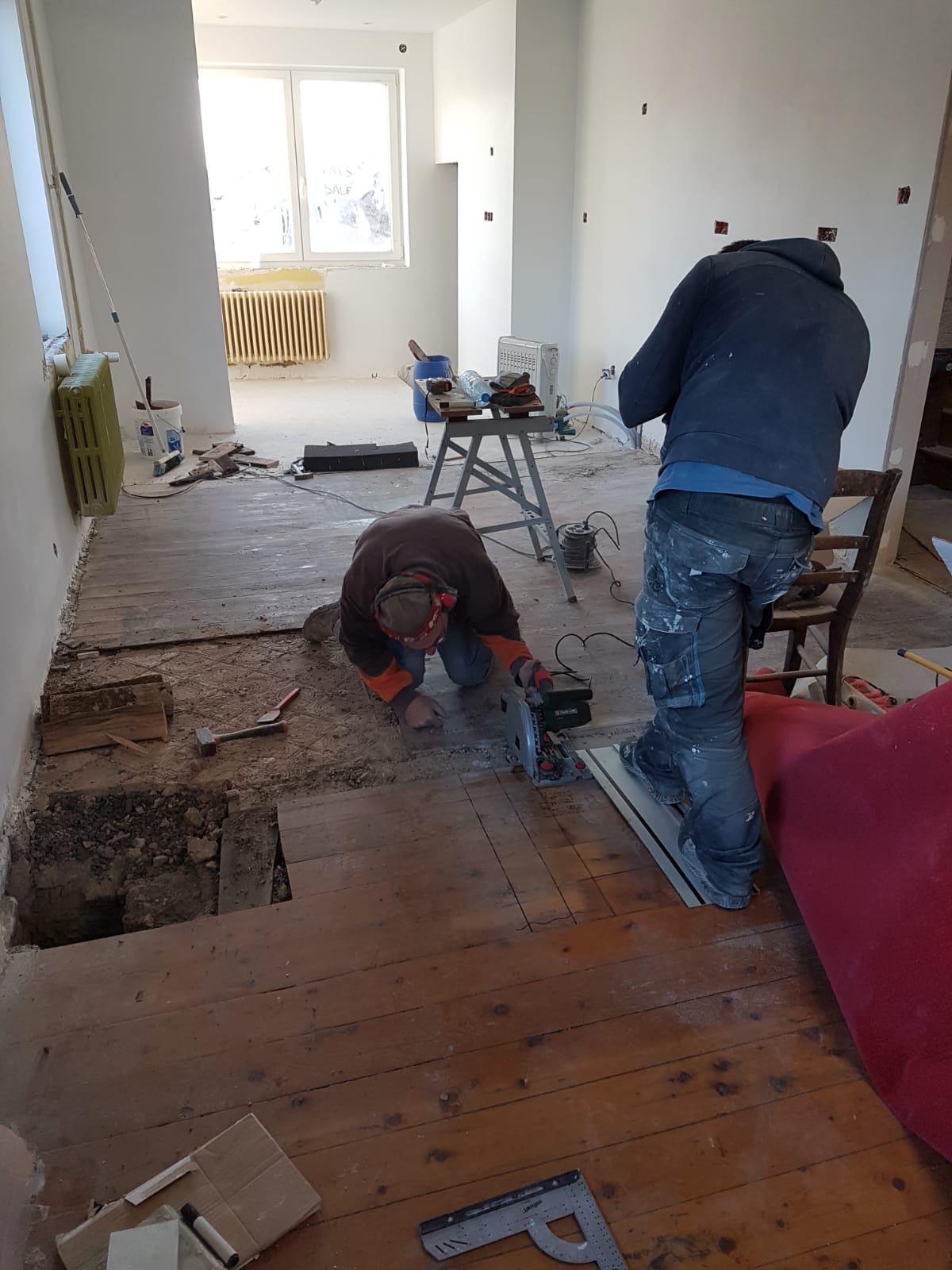 Casse du carrelage, découpage du plancher pour coller aux demandes du nouveau poêle.