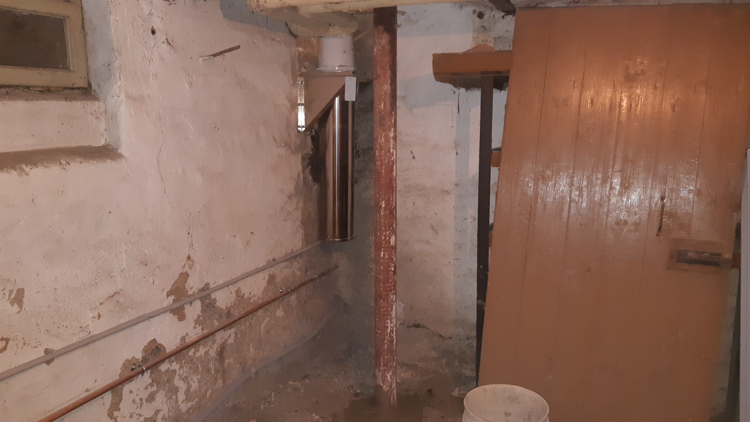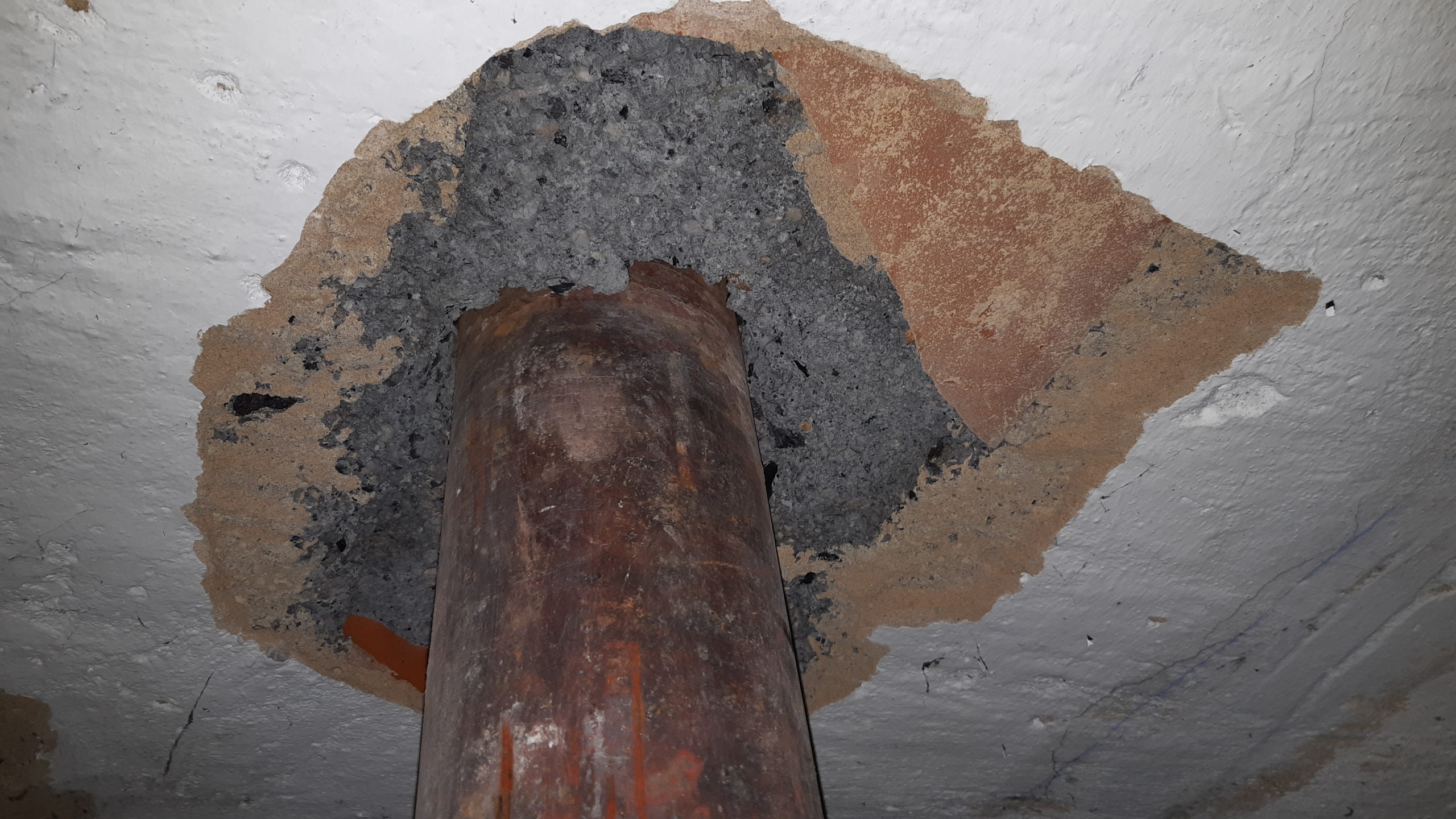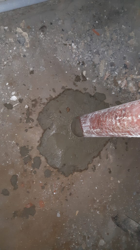 Perçage d’un diamètre 100mm depuis le haut pour la réalisation du pilier en béton à la cave pour supporter les 400kg du poêle et renforcer le socle qui va l’accueillir. Utilisation d’une vieille conduite en fonte pile poil à la bonne taille pour faire le moule. Une bétonnière complète dans la semelle du pilier et dans la colonne.