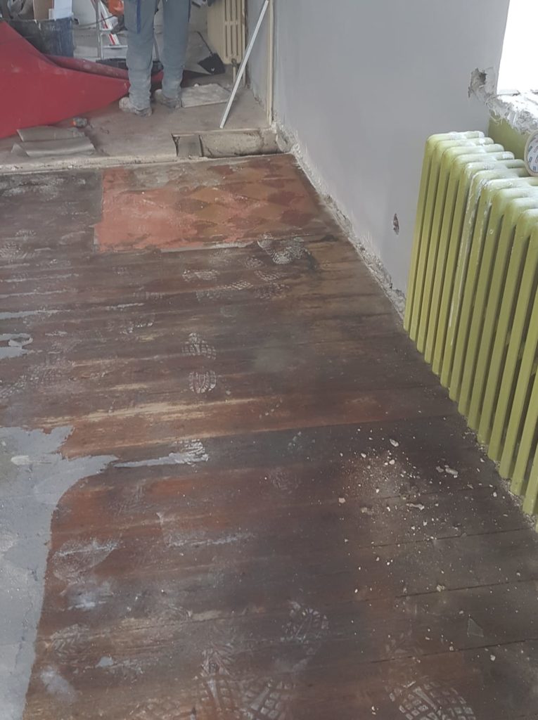 Retrait de la couche de lino qui était au-dessus du sol de la cuisine et là… surprise… le parquet est humide (mais pas pourri, ouf) et il y a un morceau de carrelage dans un coin. Ce carrelage accueillait surement il y a quelques années un poêle. Hypothèse confirmé par quelques brulures sur le parquet surement lié à des braises qui a sautées.