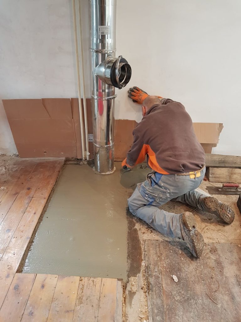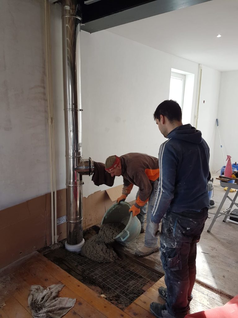 Une fois le béton à peu près sec dans la salon, réalisation du support pour le futur carrelage, aussi en béton. Une nouvelle bétonnière remplie