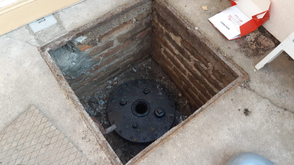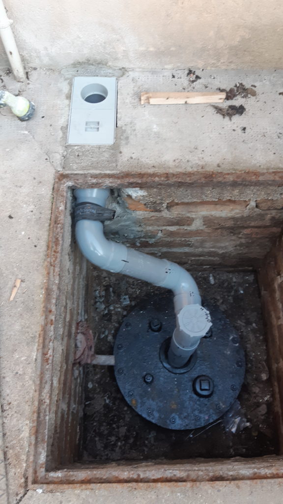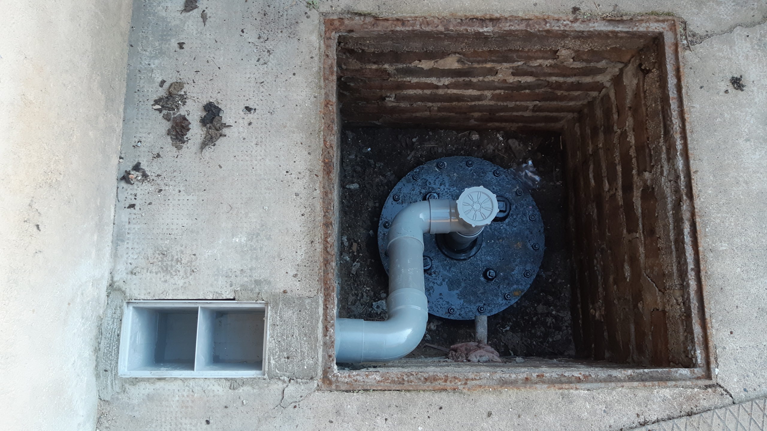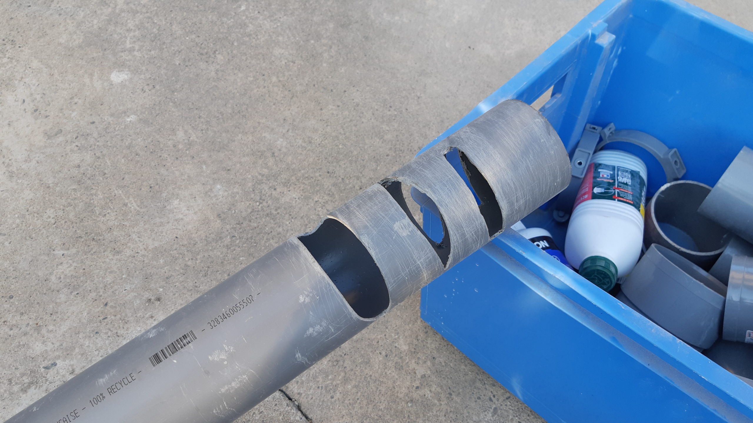 Installation du réseau d’alimentation de la cuve à eau avec un système pour éviter que l’eau de tombe directement par le haut (afin d’éviter l’usure du liner). Puis raccordement à l’égout de décantation déjà posé avant. Installation de vieille chambre à air pour assurer l’étanchéité sans collier (afin de pouvoir démonter)