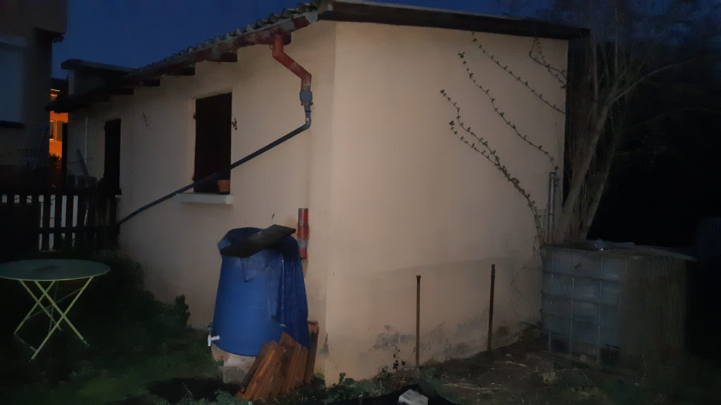 Ca y est la cuve à eau est prête pour le remplissage par l’eau de pluie. Il ne reste plus qu’à attendre… la pluie. Il faudra ensuite que l’on trouve un système de pompage autre que la pompe à eau électrique et prévoir un système de débordement ou d’arrêt de remplissage en cas de dépassement de la jauge. Bricolage avec des tubes en PVC de 40mm et des raccords.