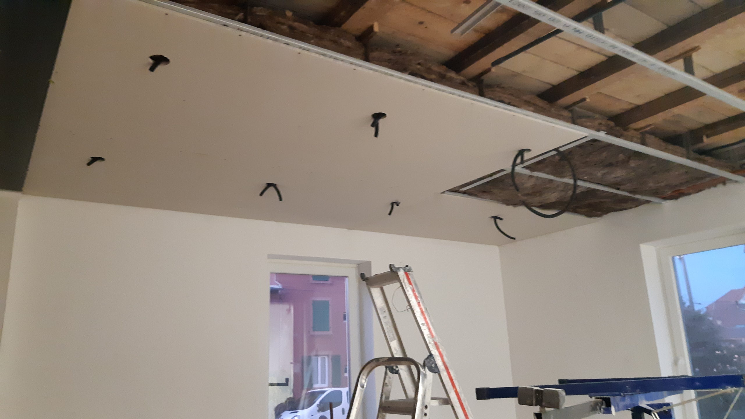Démarrage du plafond du salon avec la pose des 3 premières plaques